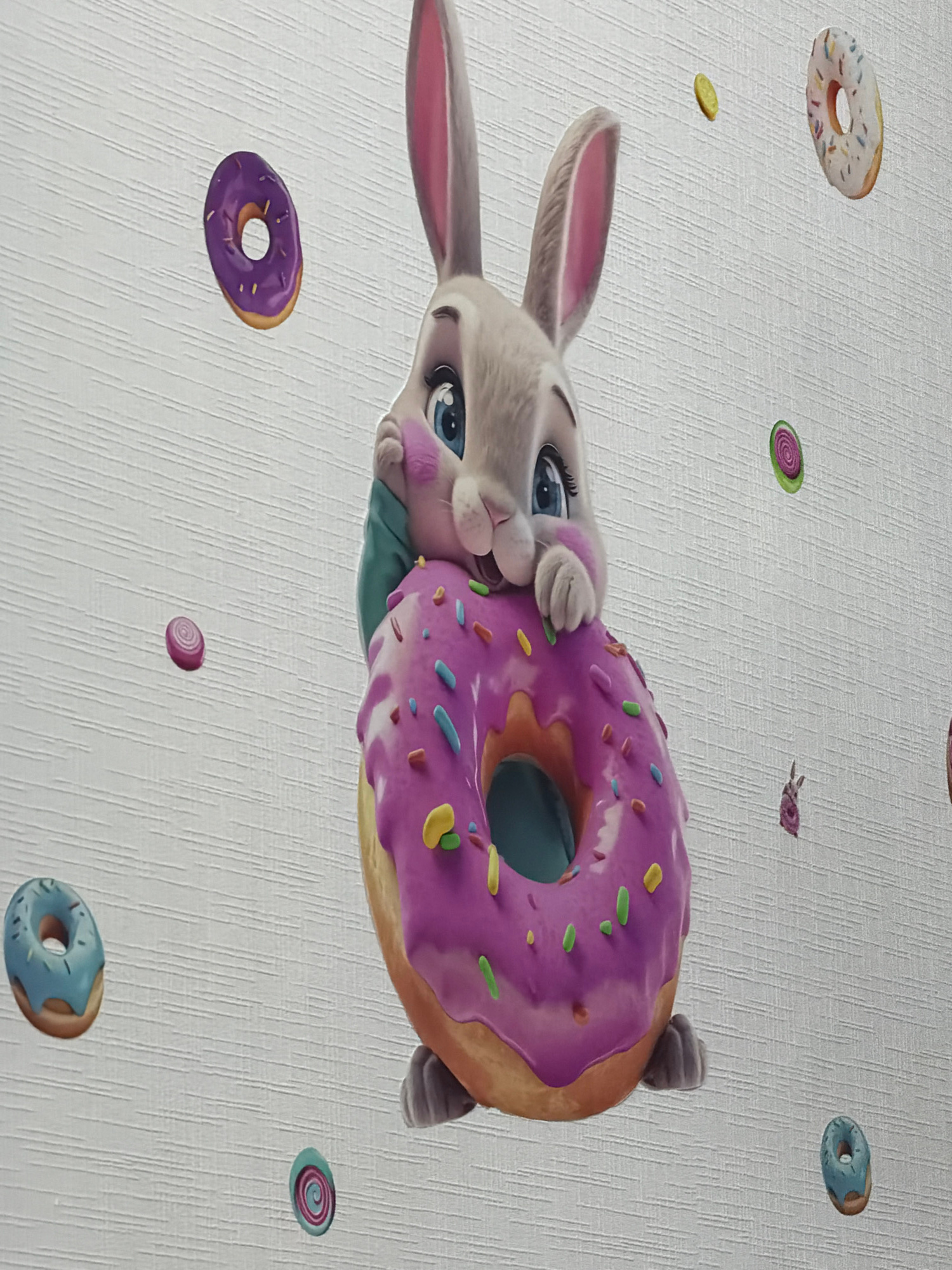 The image shows a cartoon bunny, possibly Judy Hopps from Zootopia, holding a large donut with purple frosting and colorful sprinkles. Several other smaller donuts and candies of various colors are sc…read more