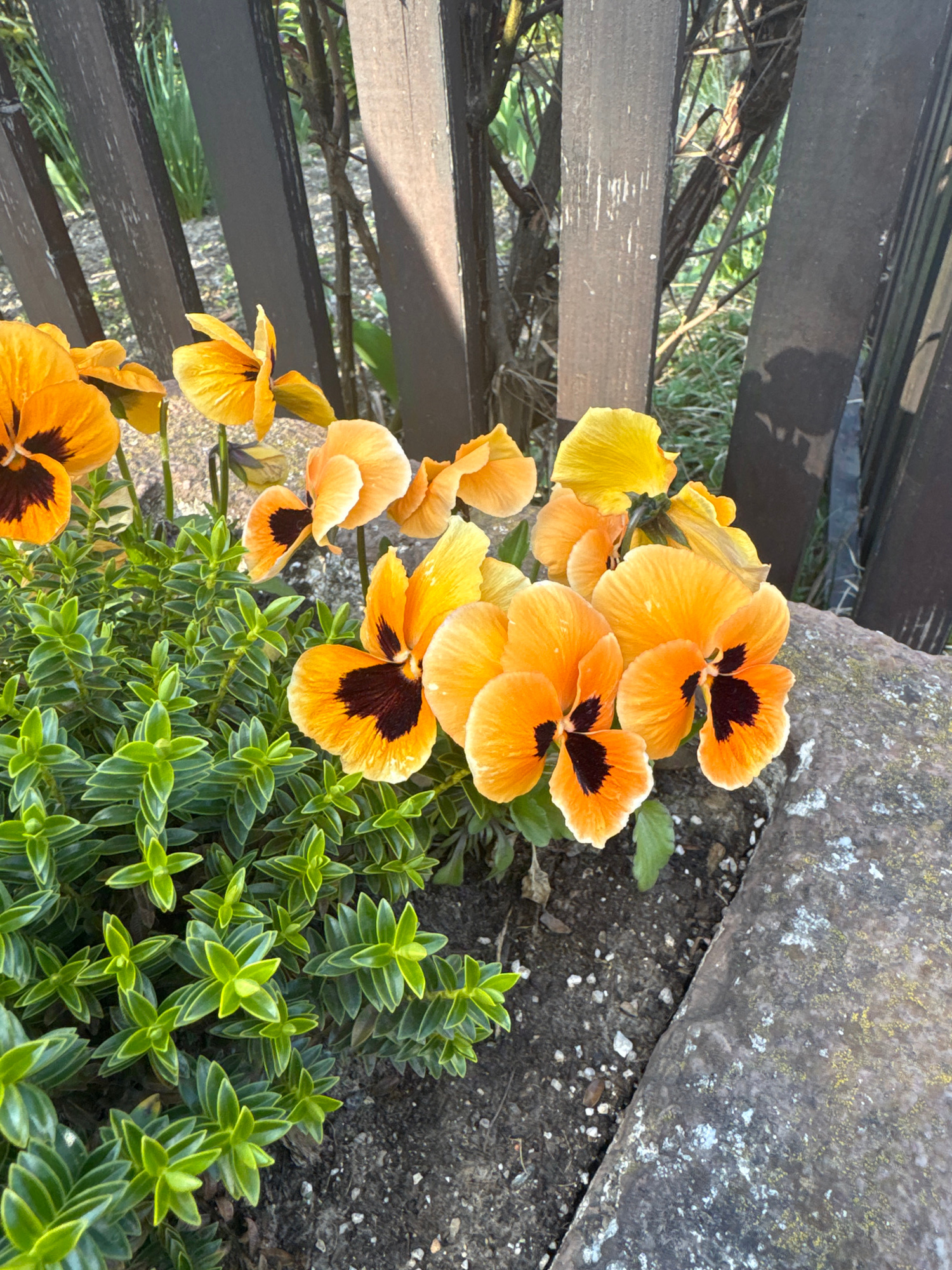 The image depicts a cluster of orange and yellow pansies with dark brown centers, positioned next to a gray, moss-covered stone and vibrant green, leafy ground cover. The flowers are arranged along th…read more