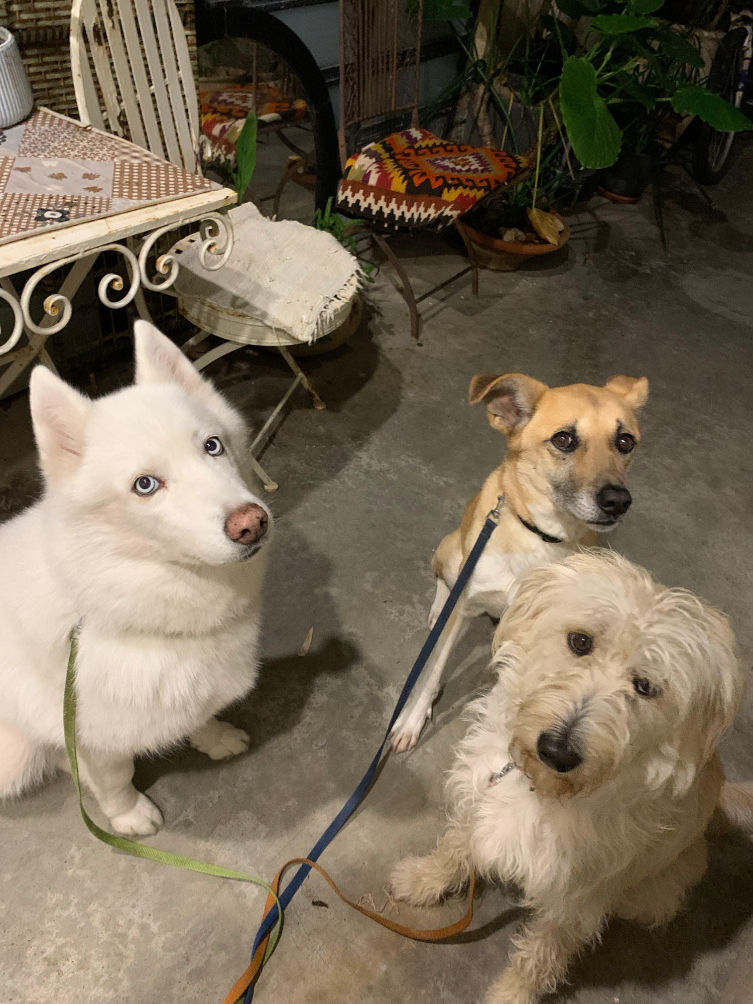 Three canines are observed sitting on a concrete surface in an urban outdoor setting, consistent with a patio or cafe in Tel-Aviv, Israel. The scene is illuminated by artificial light, suggesting even…read more
