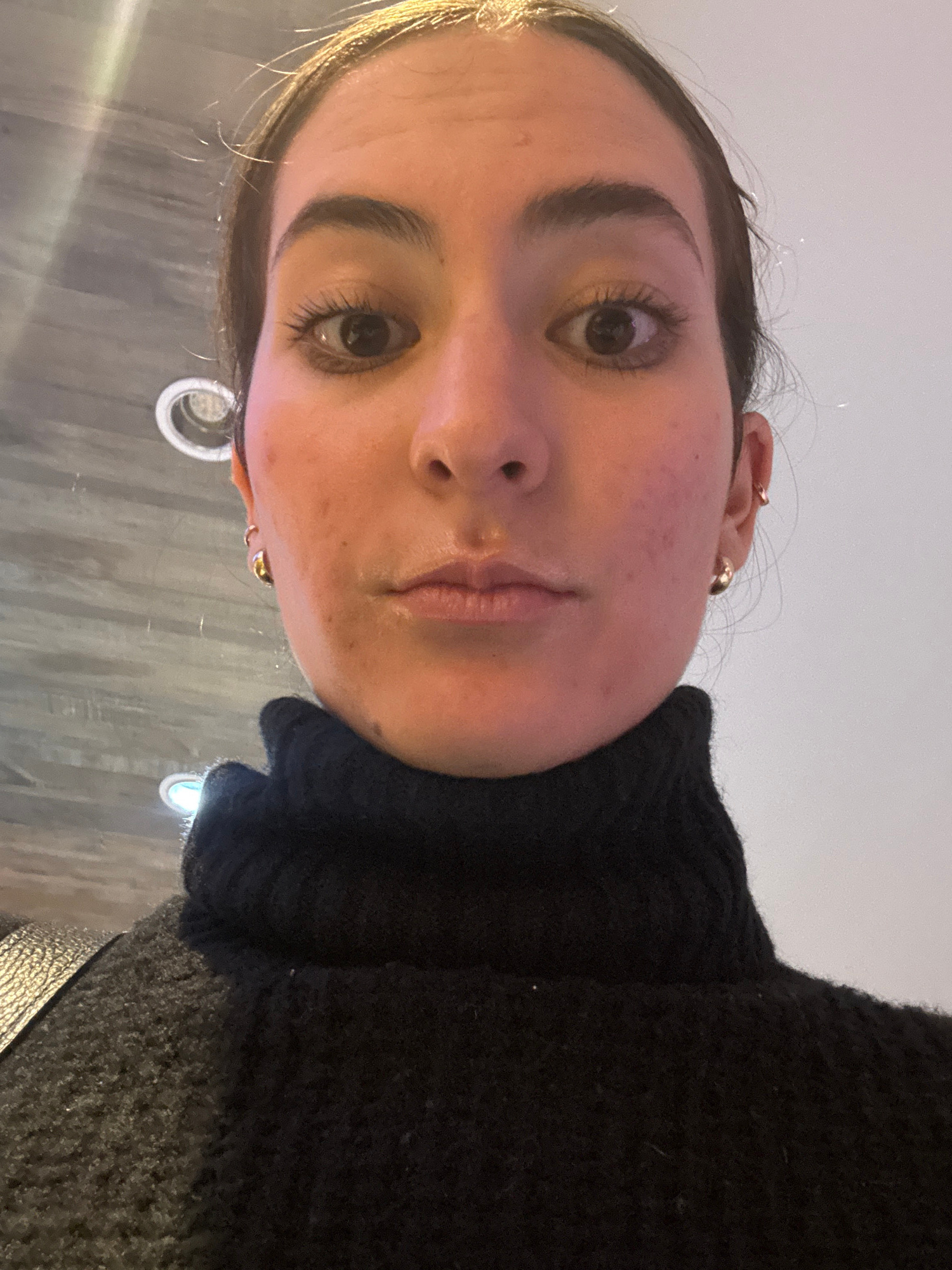 A close-up, low-angle selfie of a fair-skinned person with brown eyes and dark eyebrows, wearing a black turtleneck sweater. Gold earrings are visible. The background is nondescript, possibly an interβ¦read more