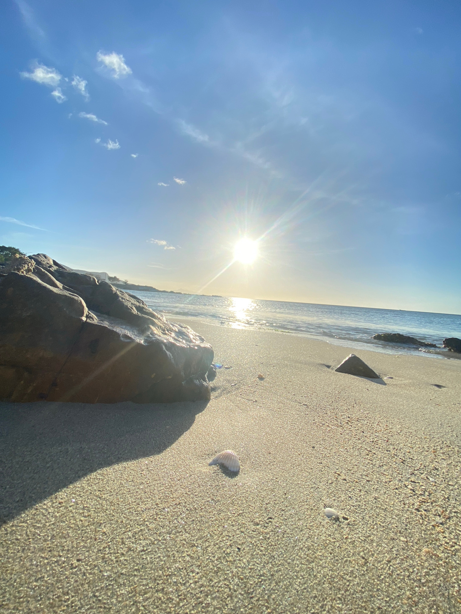 The image depicts a sunlit beach scene in Juan Griego, Venezuela, under a clear blue sky. The sun, appearing as a bright, starburst light source, is low over the ocean in the upper right-center, refle…read more