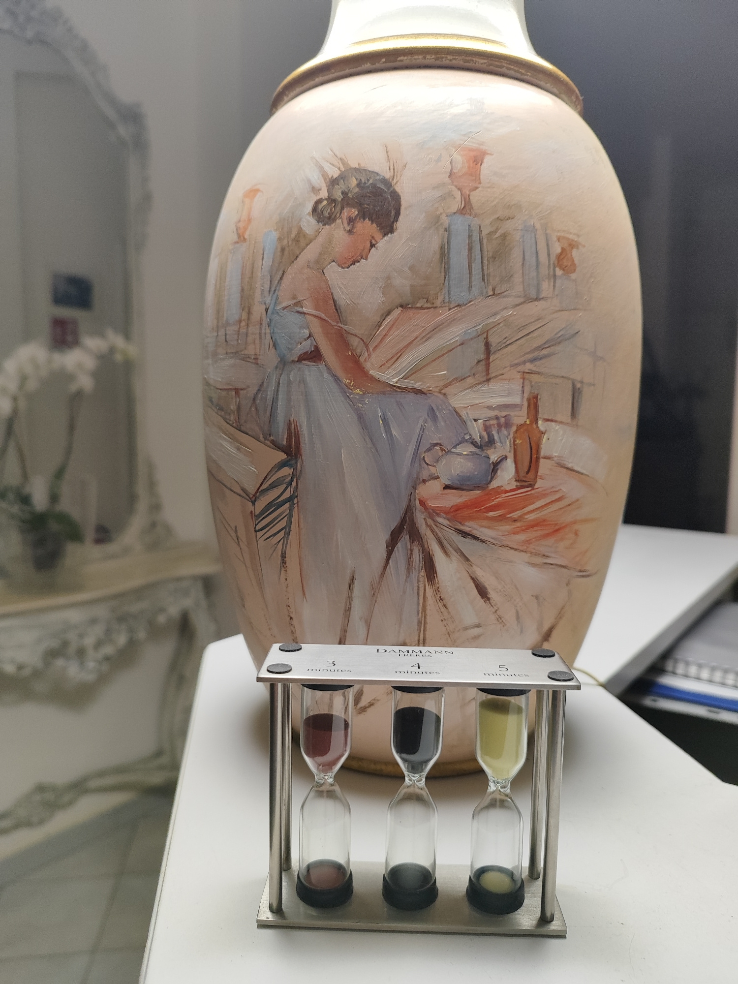 The image presents a close-up shot of a tabletop in an interior setting. In the foreground is a metal-framed hourglass featuring three separate timers labeled "3 minutes", "4 minutes", and "5 minutes"…read more