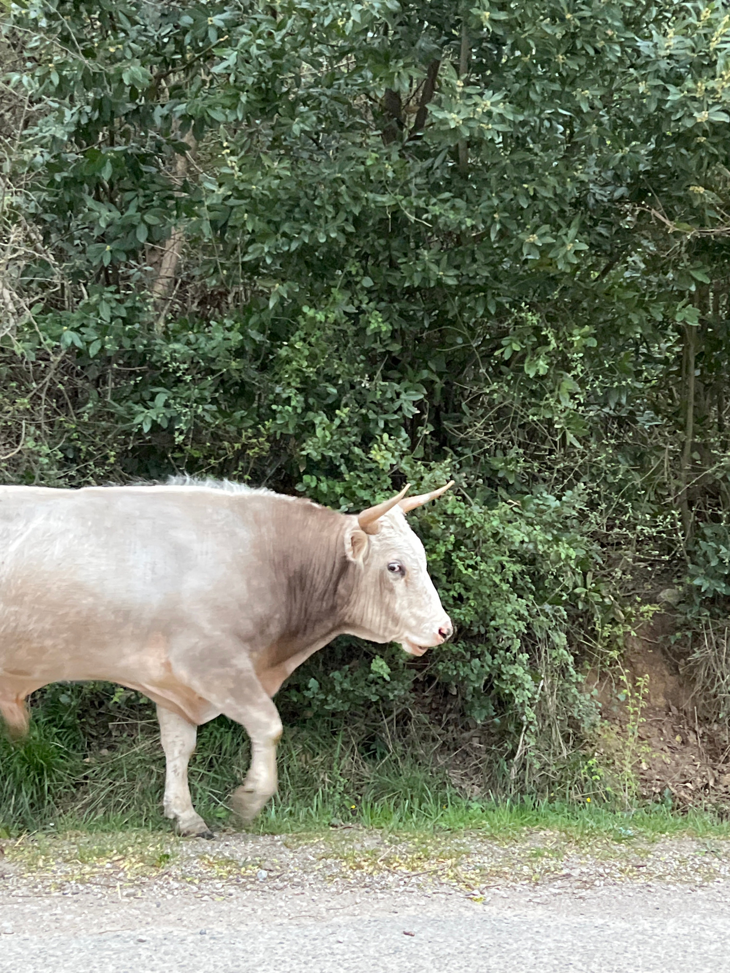 A tan cow with horns stands on the edge of a road in Prijevor, Montenegro. The cow is positioned between a green thicket of bushes and a paved road. The cow is looking upwards and slightly to the righ…read more