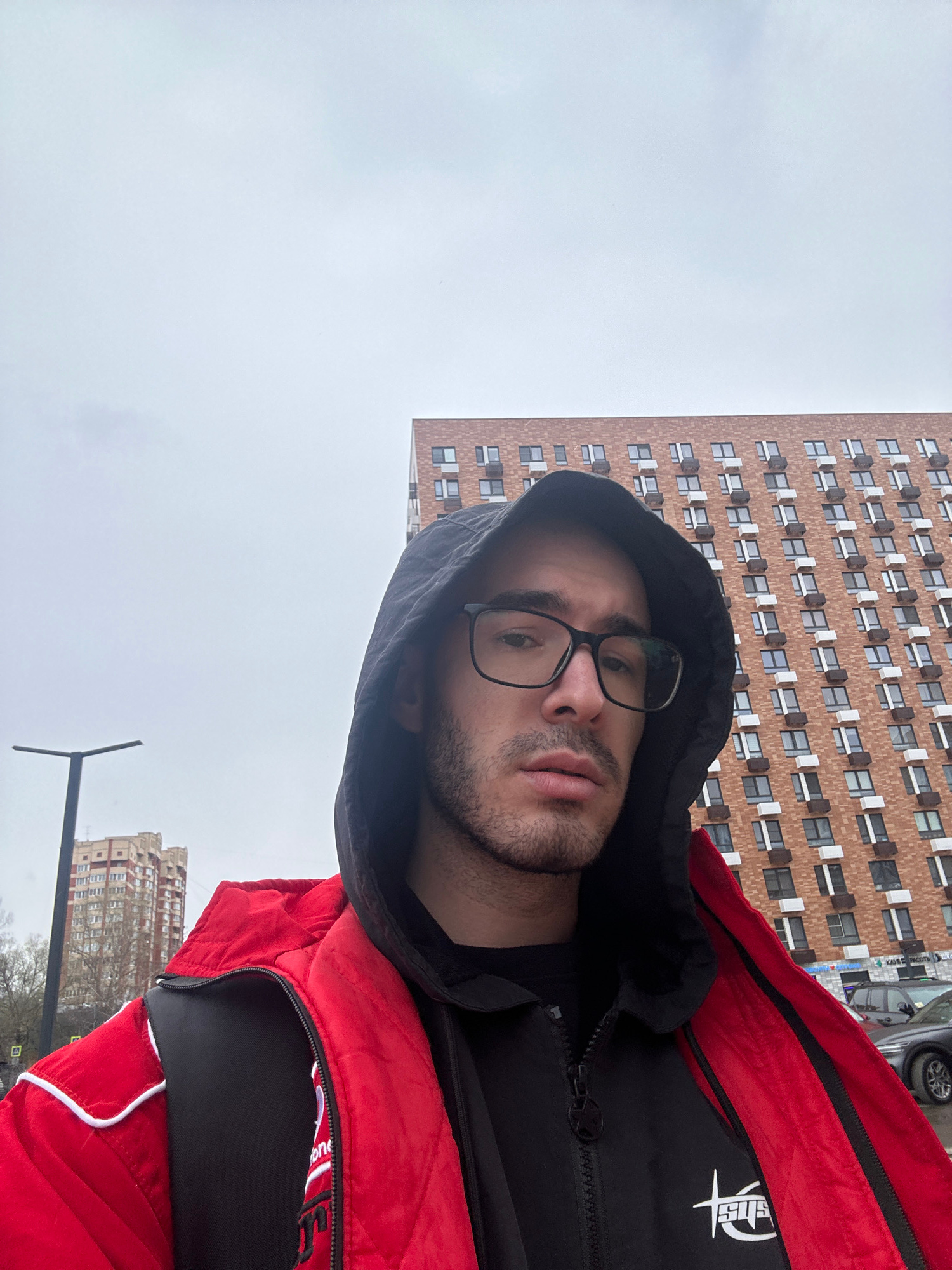A man with glasses and a hooded jacket takes a selfie outside, with a tall residential building behind him. The location appears to be Moscow, Russia, based on the architectural style of the building,…read more