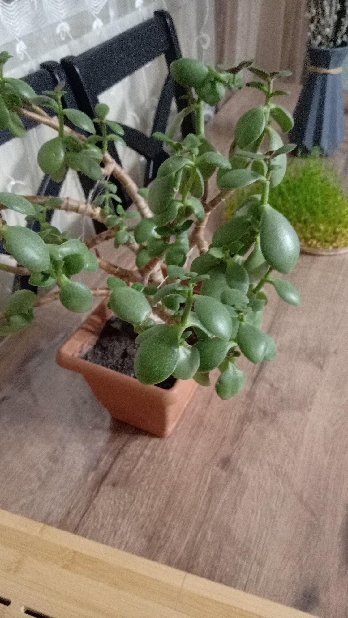 A medium close-up shot of a jade plant in a terracotta pot on a wooden surface. The plant has thick, green, oval-shaped leaves and brown stems. Behind the plant are two black chairs and a white curtaiβ¦read more