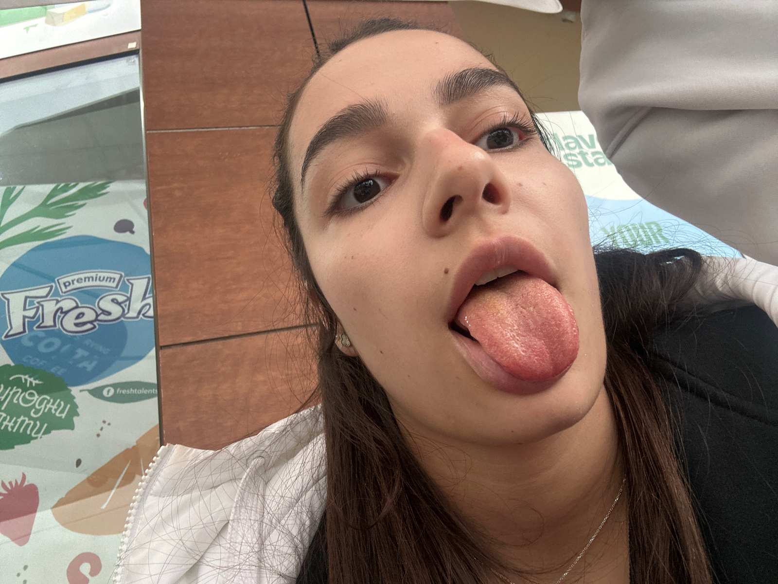 This close-up indoor shot features a young woman with dark hair and prominent eyebrows, captured from a low angle. She is sticking out her tongue, looking directly upwards towards the camera, conveyin…read more