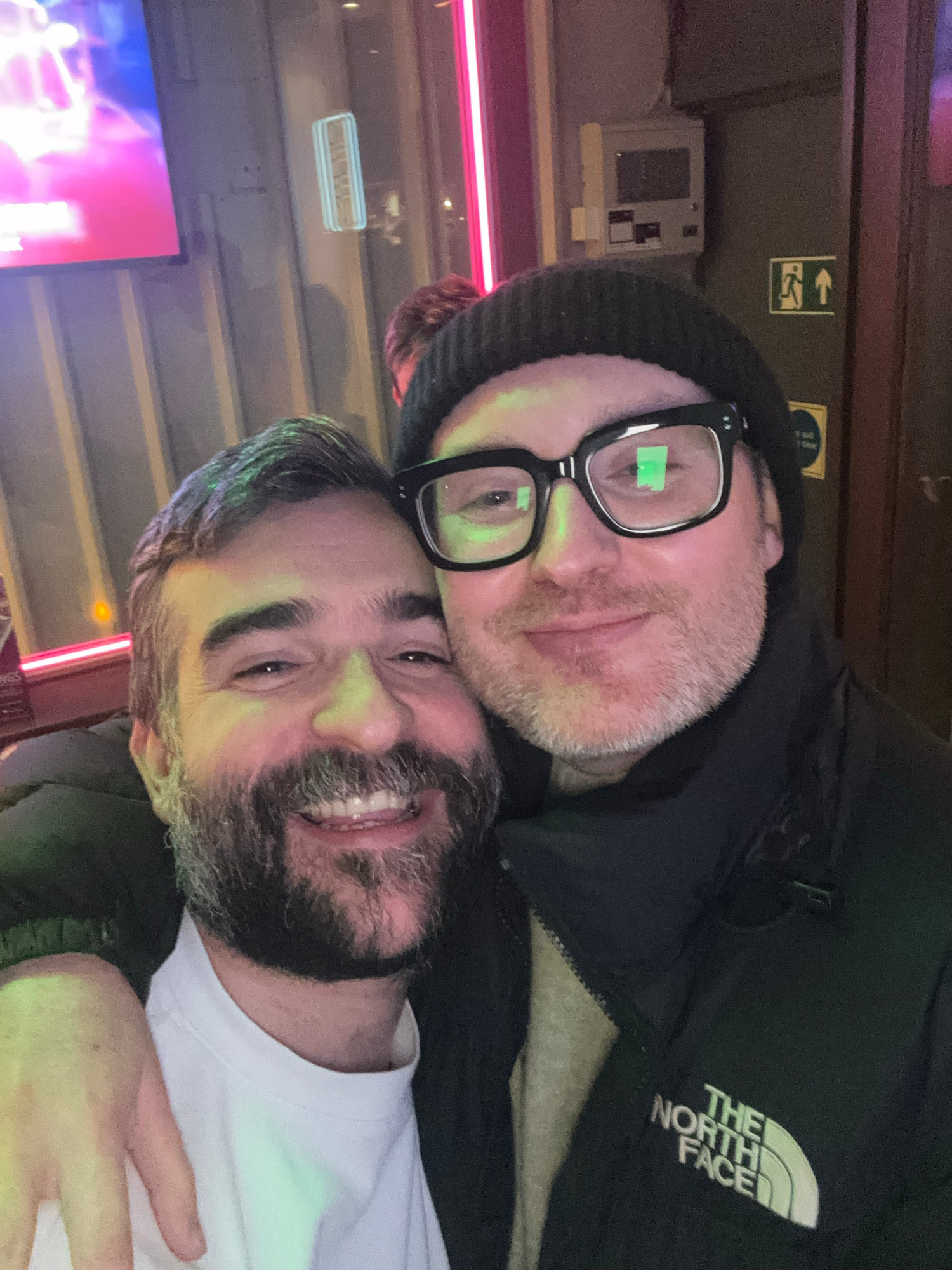 Two men are posing closely together for a photograph. The man in the foreground has dark hair, a full beard, and is wearing a white t-shirt. He is smiling and facing the camera. The other man behind h…read more