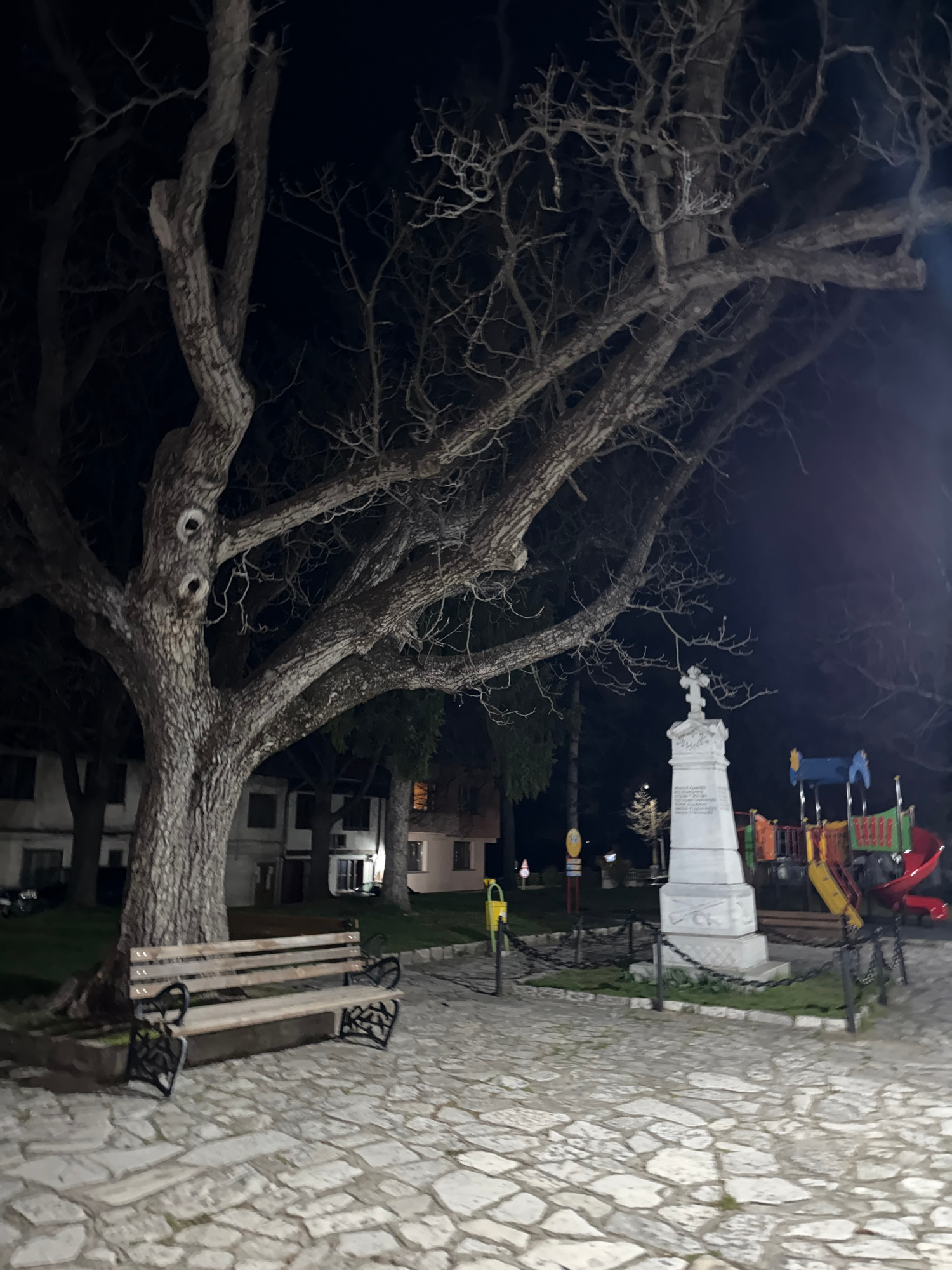 The image captures a night scene in Razlog, Bulgaria. A large, bare tree dominates the left side of the frame, extending into the darkness. Adjacent to the tree, a wooden bench sits on a cobblestone p…read more