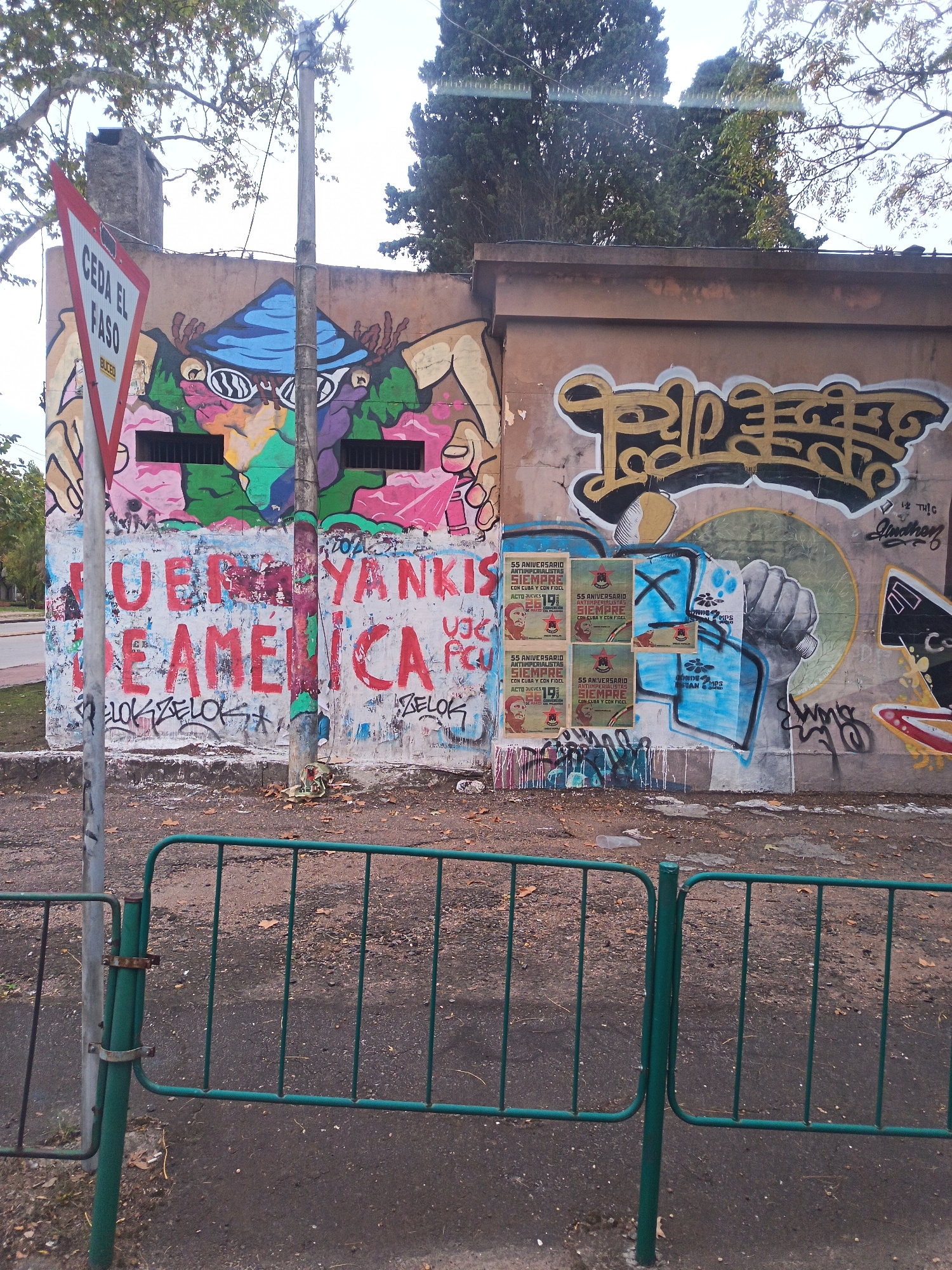 This photograph captures a wall in Montevideo, Uruguay, covered in a diverse array of graffiti, street art, and political posters. The wall is constructed of a light-brown material and features rectan…read more