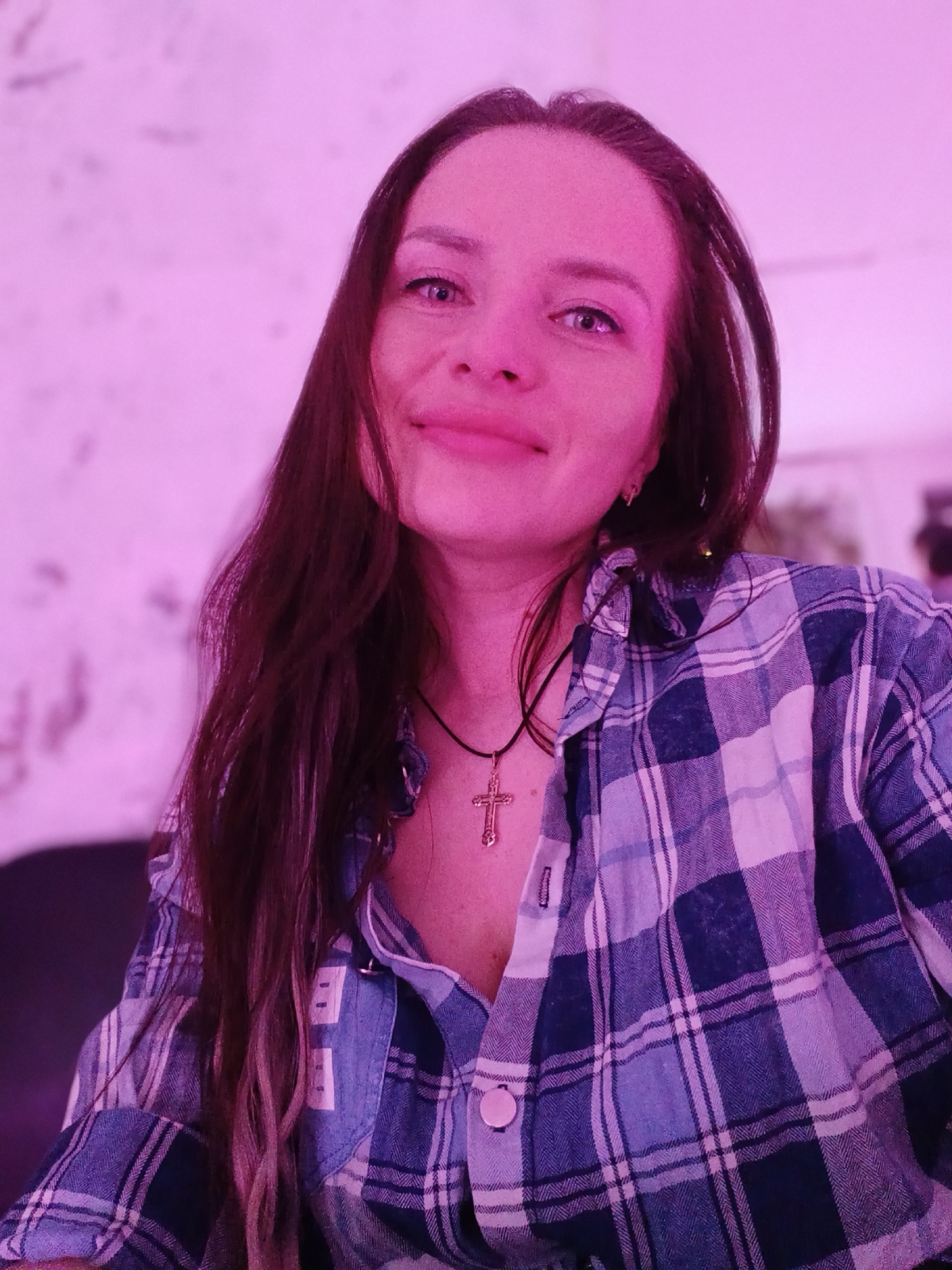 A woman with long brown hair is looking at the camera with a slight smile. She is wearing a blue and white plaid shirt and a necklace with a cross. The lighting in the image has a pink tint. The locat…read more