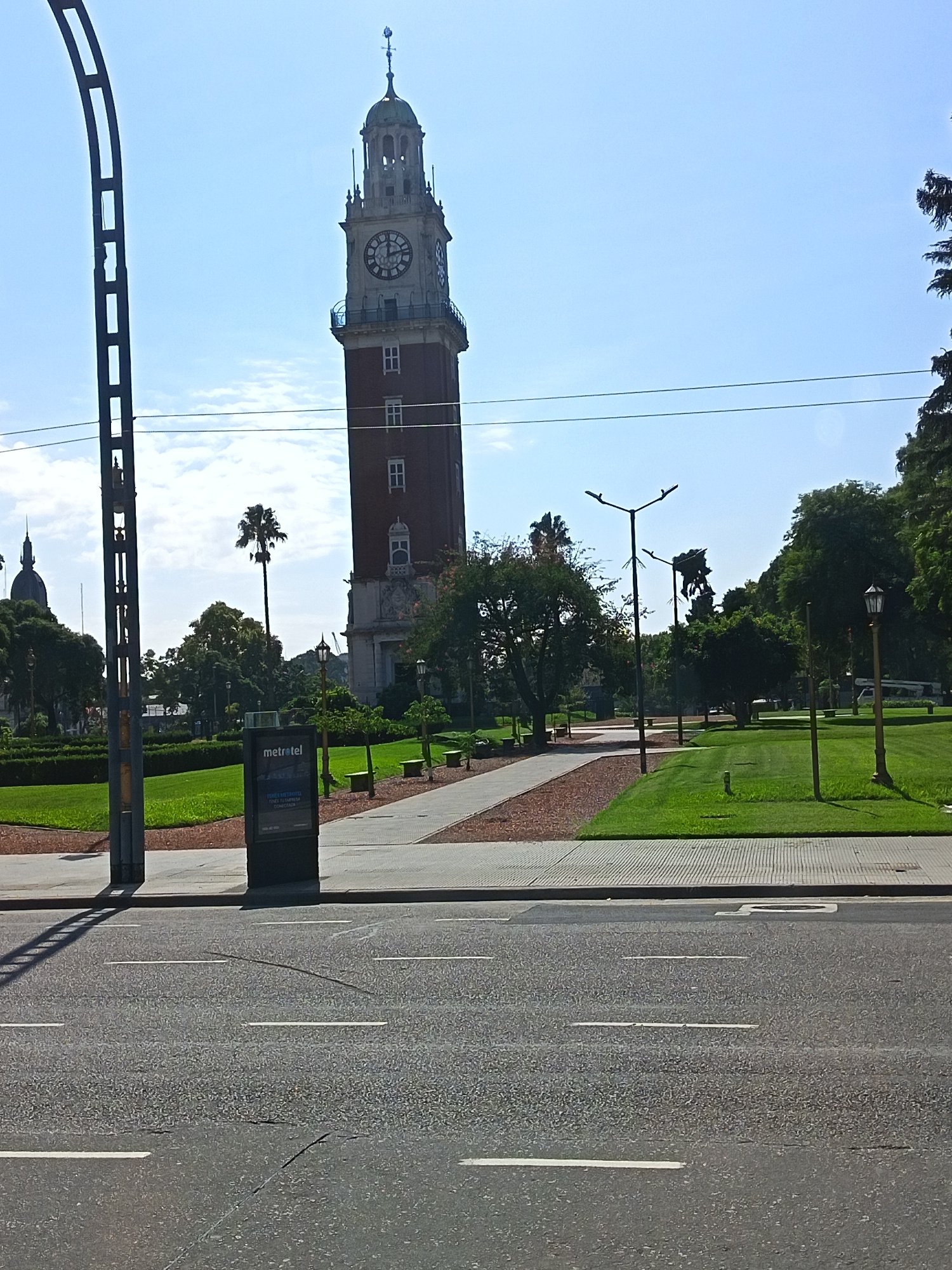 The image shows a daytime view of the Torre Monumental (also known as the Torre de los Ingleses or English Tower) in Buenos Aires, Argentina. The tower, a tall brick structure with a clock face, domin…read more