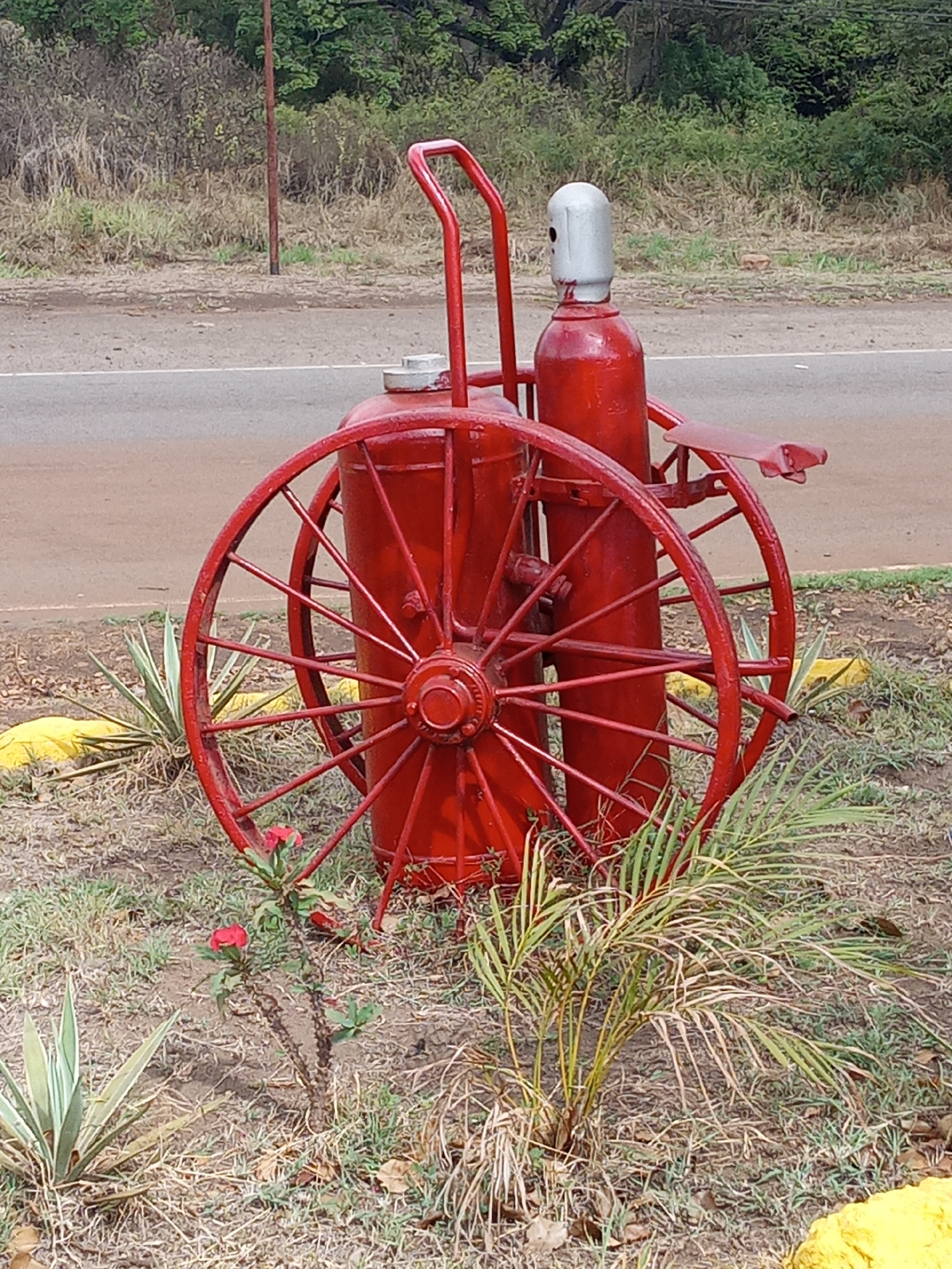 In Guayana City, Venezuela, a vintage-style red fire extinguisher apparatus stands as an ornamental piece beside a road. The device consists of two large, spoked wheels supporting a cylindrical tank a…read more