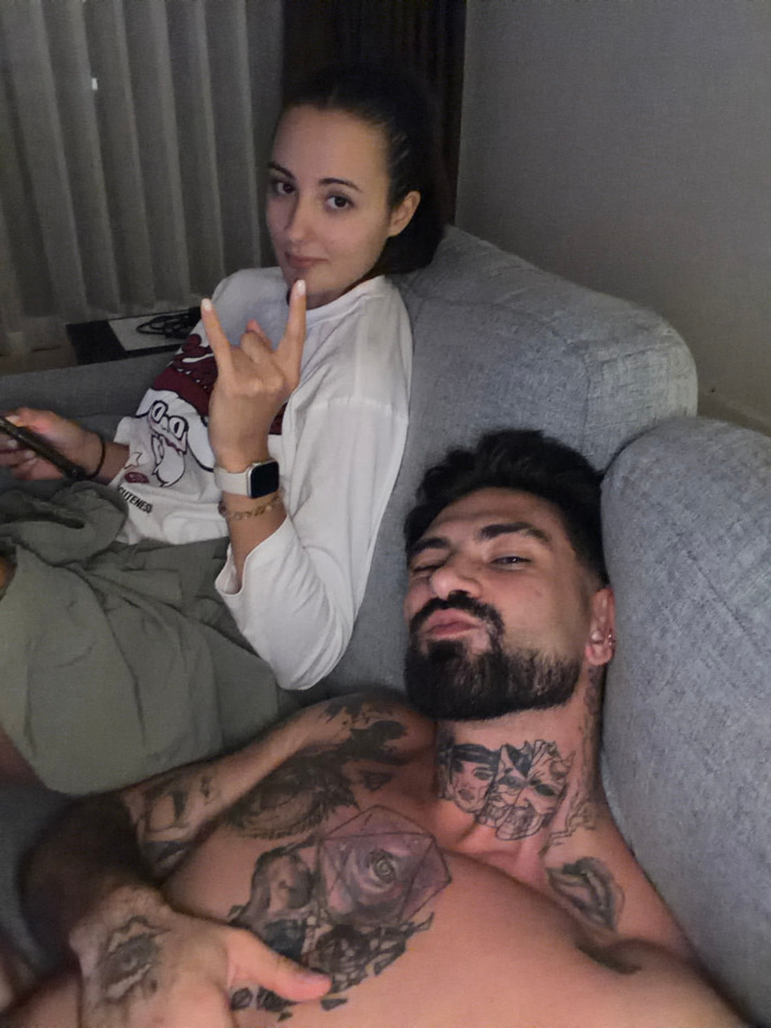 This indoor photograph depicts two individuals, a female and a male, positioned on a light-grey upholstered couch or armchair. The scene is located in an interior space identified as being in Bangkok,…read more