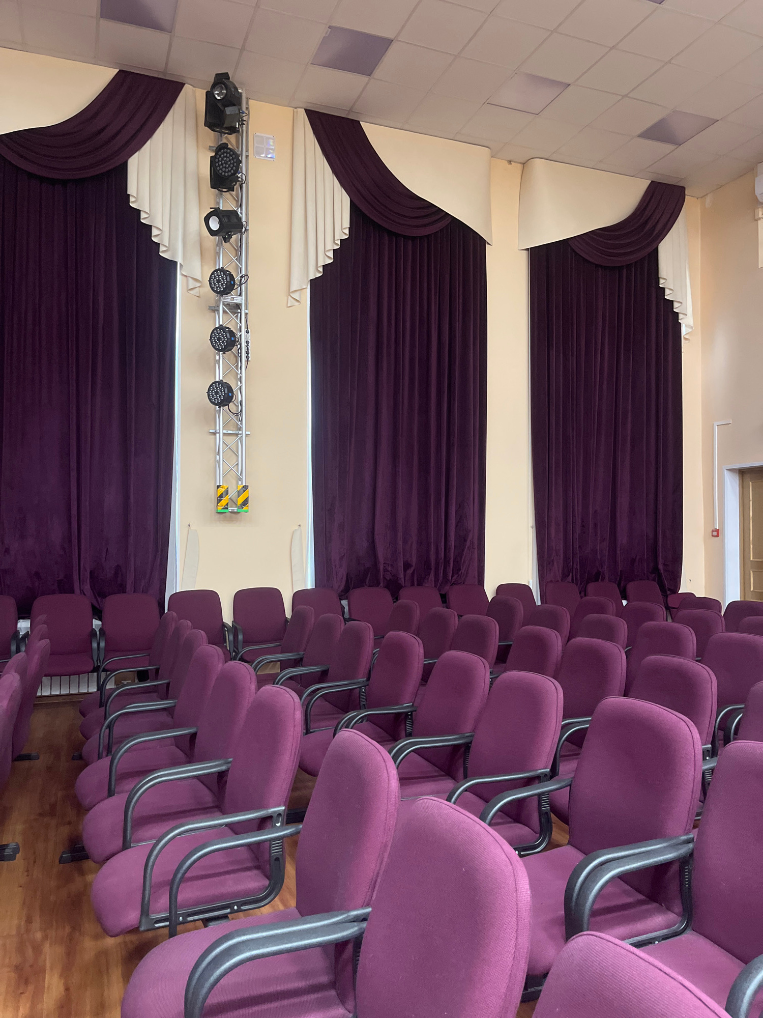 The image shows a room, likely a theater or auditorium, with rows of empty purple upholstered chairs. The chairs have black metal frames. The wall behind the chairs is decorated with alternating secti…read more