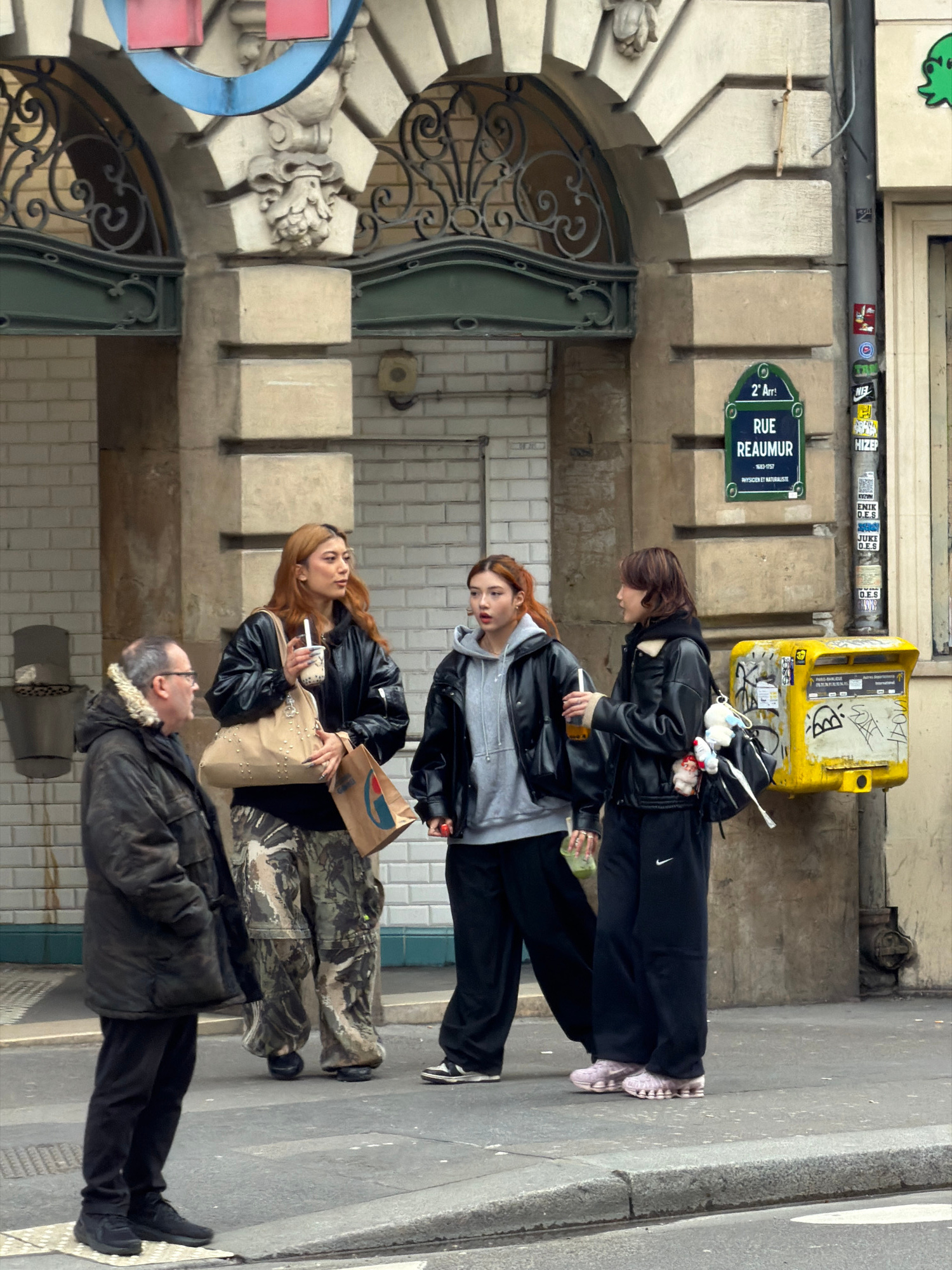 The image displays an urban street scene on Rue Réaumur, located in the 2nd Arrondissement of Paris, France, as indicated by a prominent street sign. Four individuals are positioned on a paved sidewa…read more