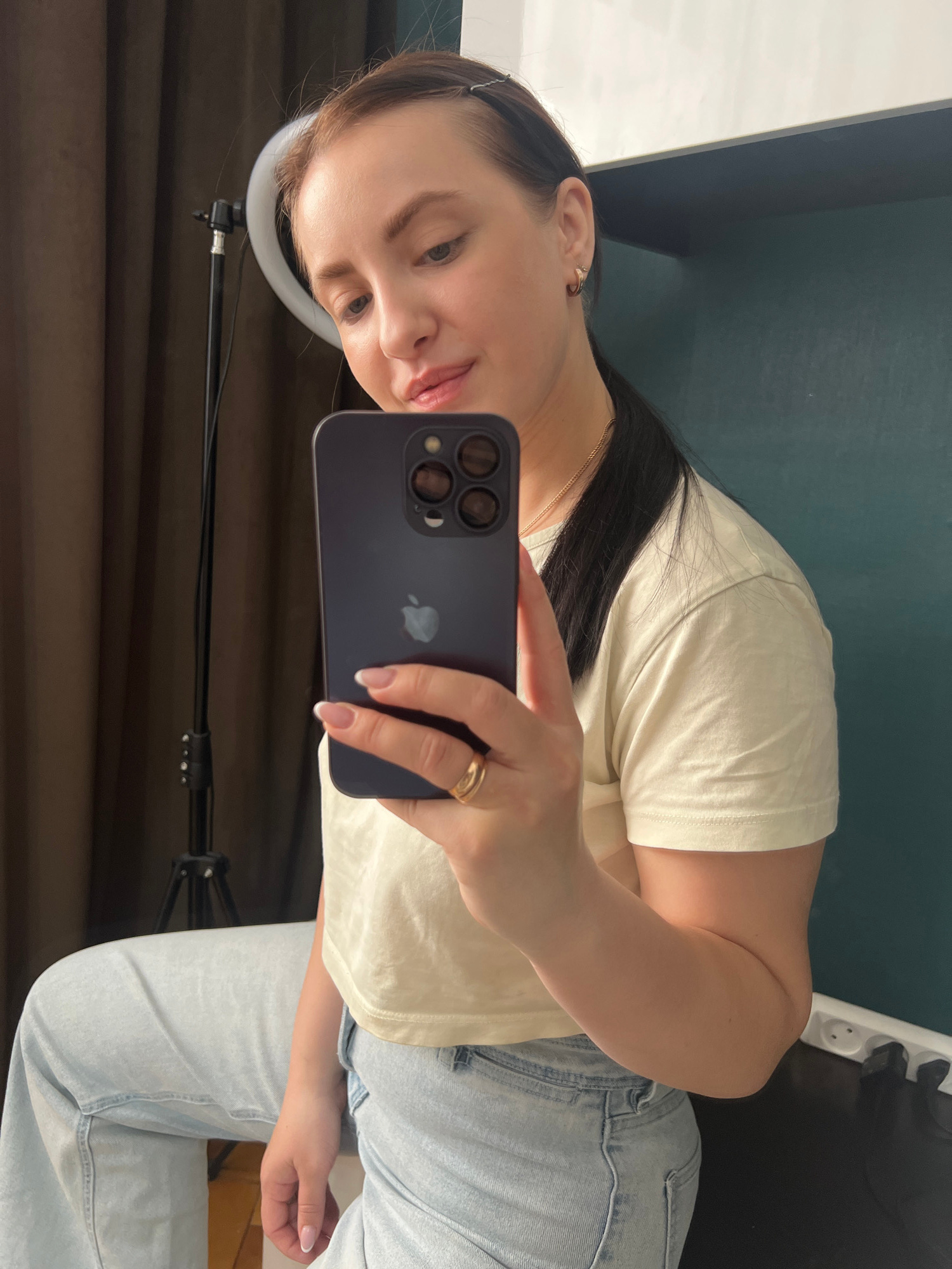 A woman is taking a selfie with a dark purple smartphone. She is wearing a beige t-shirt and light blue jeans. She has dark hair and a gold ring on her finger. A ring light is visible in the lower-lef…read more