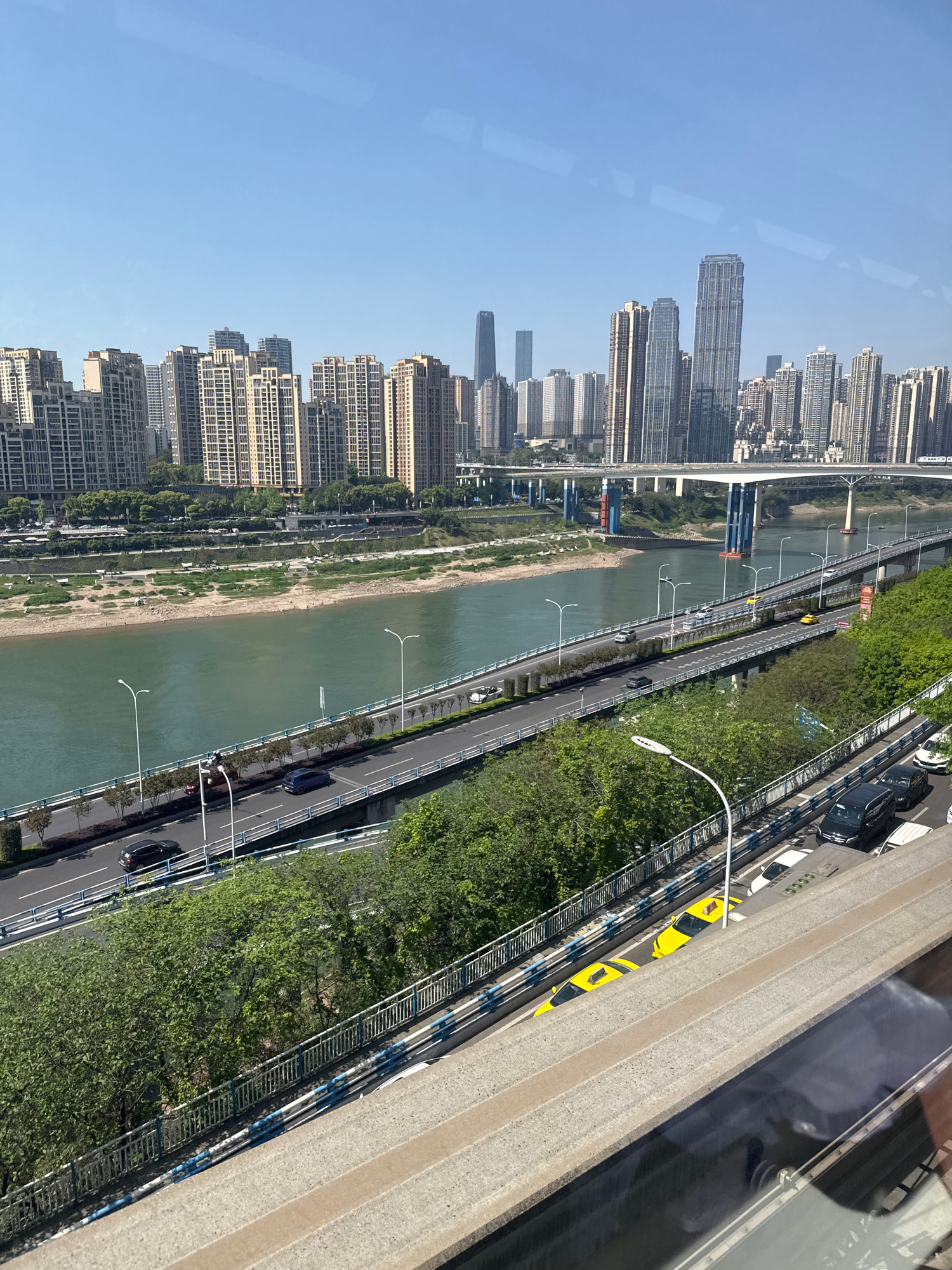 Yuzhong District, Chongqing, China. A river runs parallel to a highway and a train track, lined with trees. High-rise buildings dominate the horizon. The image is taken from a high vantage point, poss…read more
