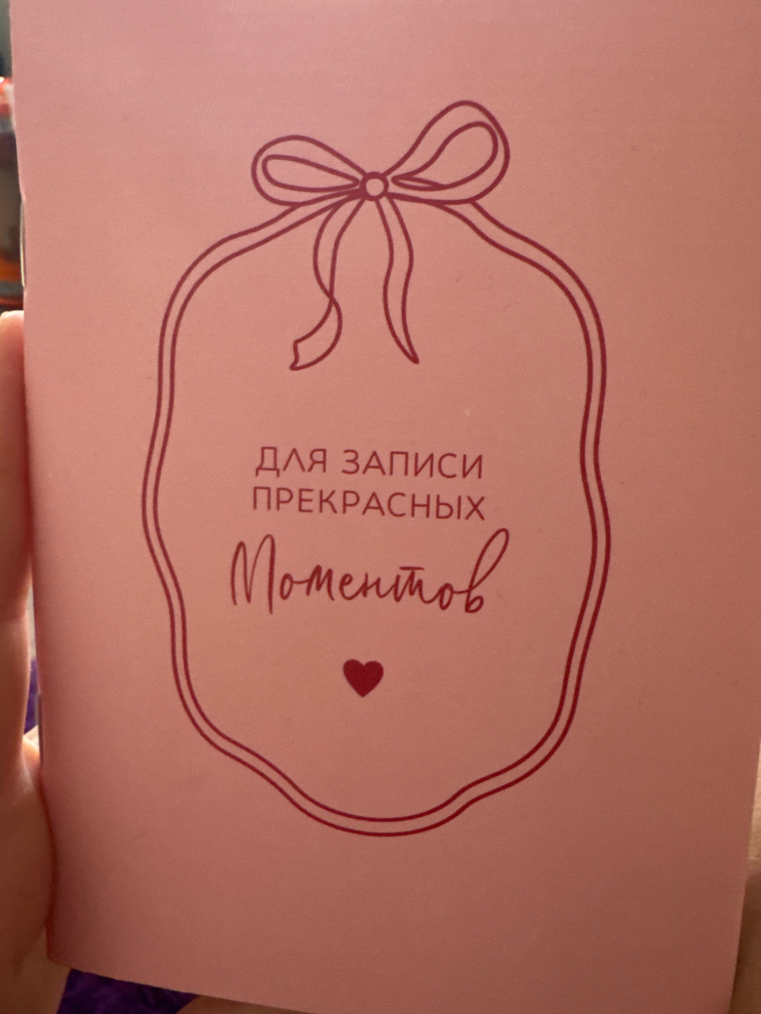 The image shows a pink notebook with a red illustration on the front. The illustration consists of a ribbon on the left, the words "ДЛЯ ЗАПИСИ ПРЕКРАСНЫХ Моментов" (FOR WRITING BEAUTIFUL Moments) writ…read more