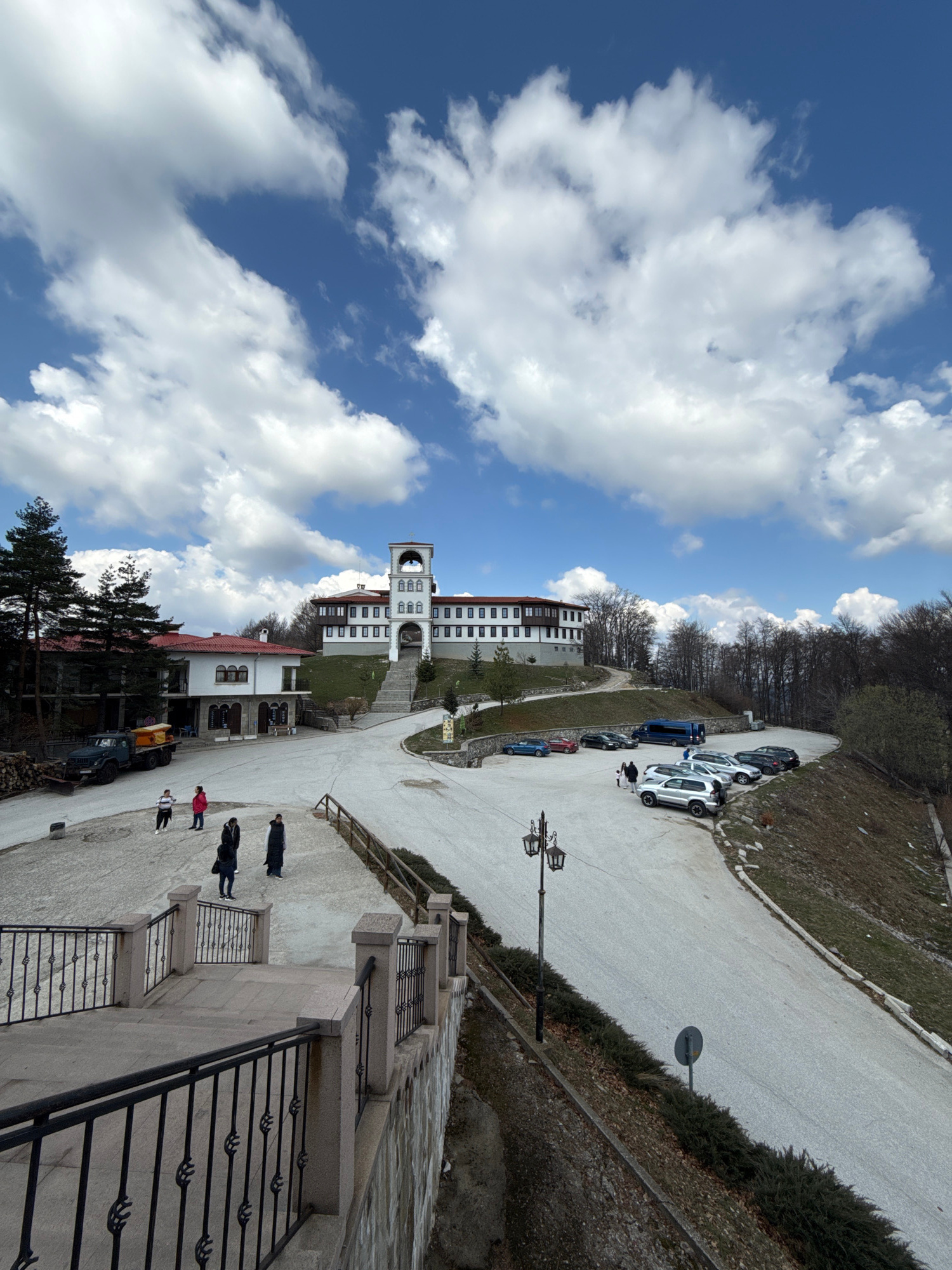 The image presents an elevated view of the Bachkovo Monastery complex near Mostovo, Bulgaria. The foreground features a portion of a stone and iron railing of a staircase leading down to a walkway. A…read more