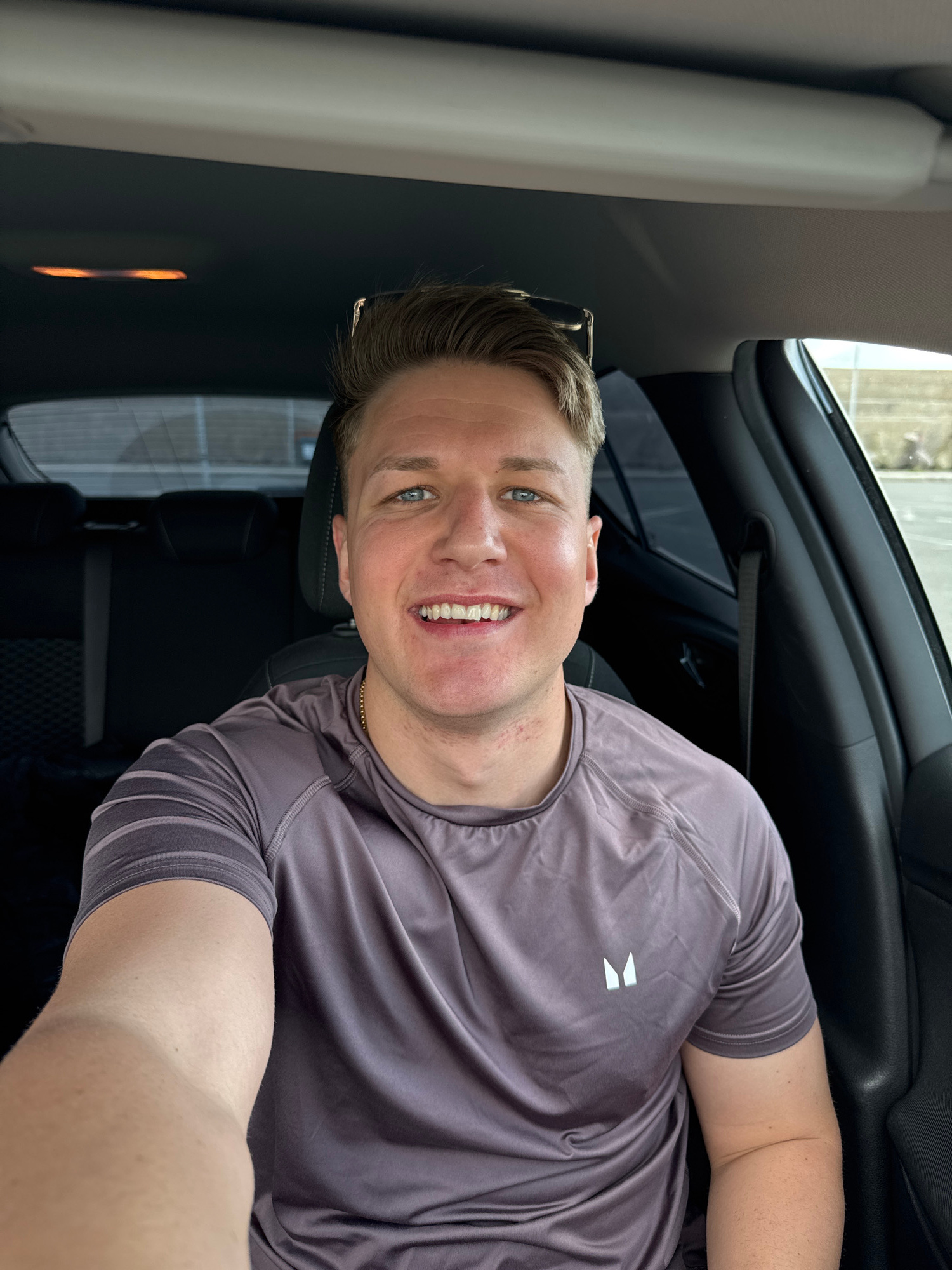 A man in a mauve athletic shirt is in the front seat of a car. He is smiling and taking a selfie. The background shows the car's interior and a blurry outdoor scene. It is impossible to confirm the lo…read more