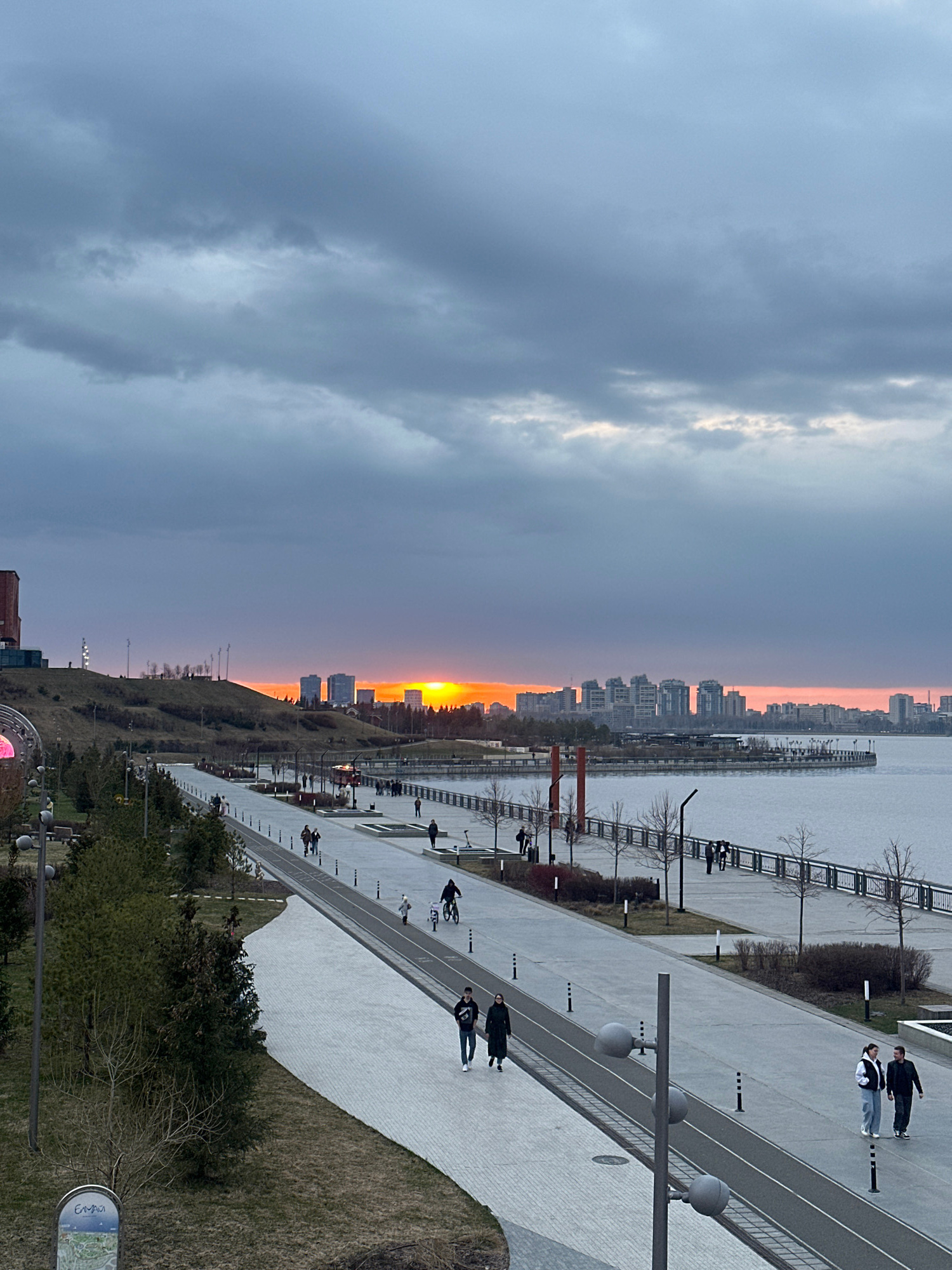 The image shows a panoramic view from a high vantage point in Kazan, Russia, during a sunset. **Environment:** A wide river or body of water stretches horizontally across the middle of the frame, sep…read more