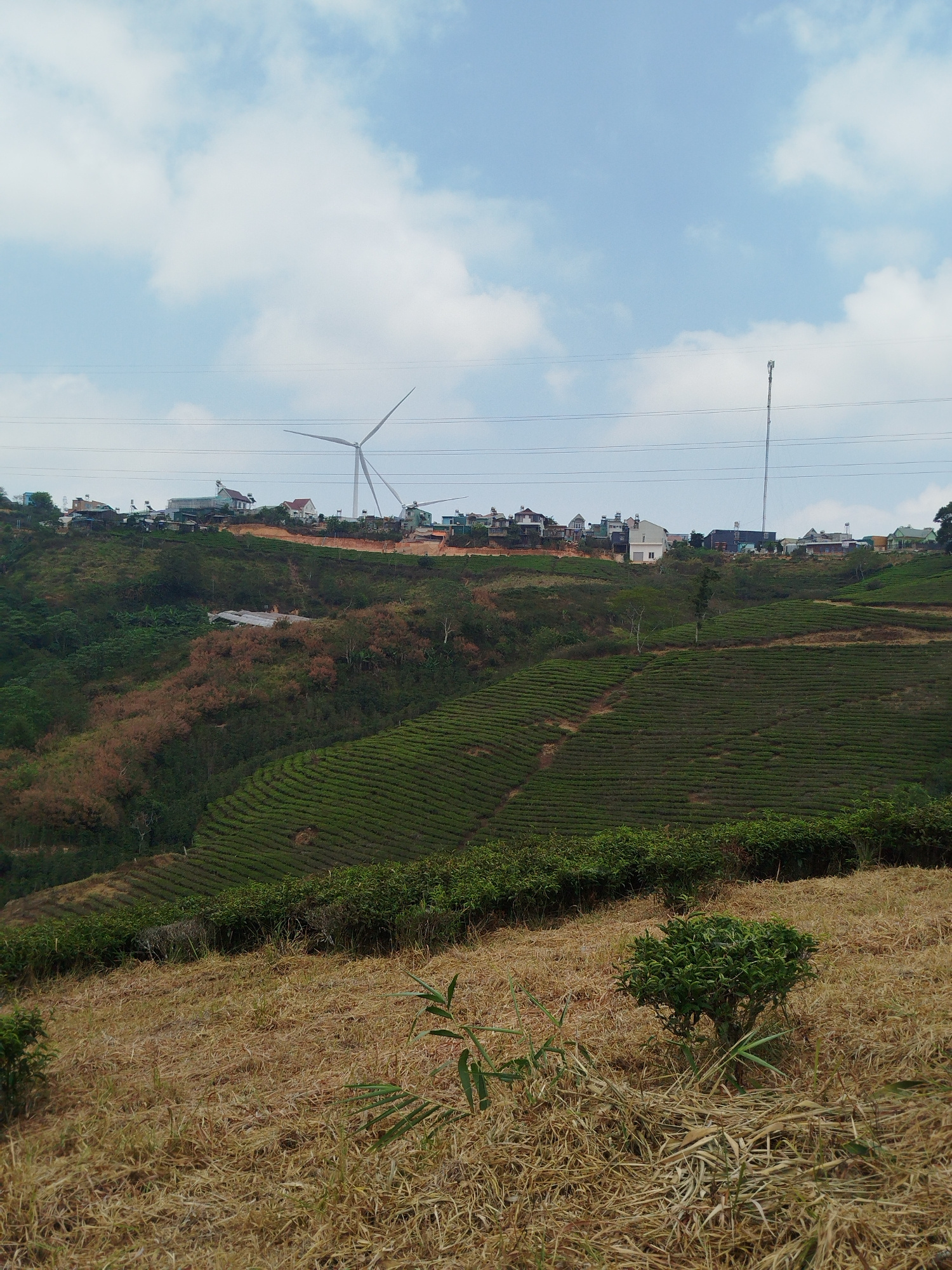The image depicts a hillside landscape in Trường Thọ, Vietnam. In the foreground, dry, golden-brown grass and sparse vegetation cover the slope. A small, green shrub stands out amidst the dry grass. F…read more
