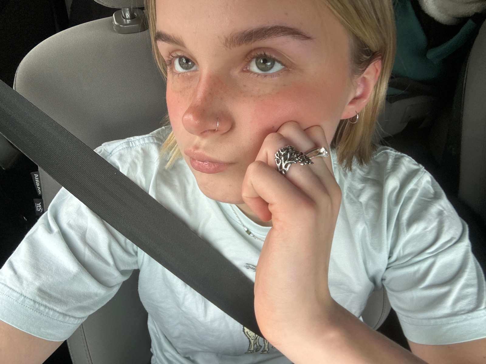 A young woman is depicted from an upside-down perspective, likely taken inside a car. She is wearing a light-colored t-shirt and has a seatbelt across her torso. She has a ring on her hand, which is n…read more