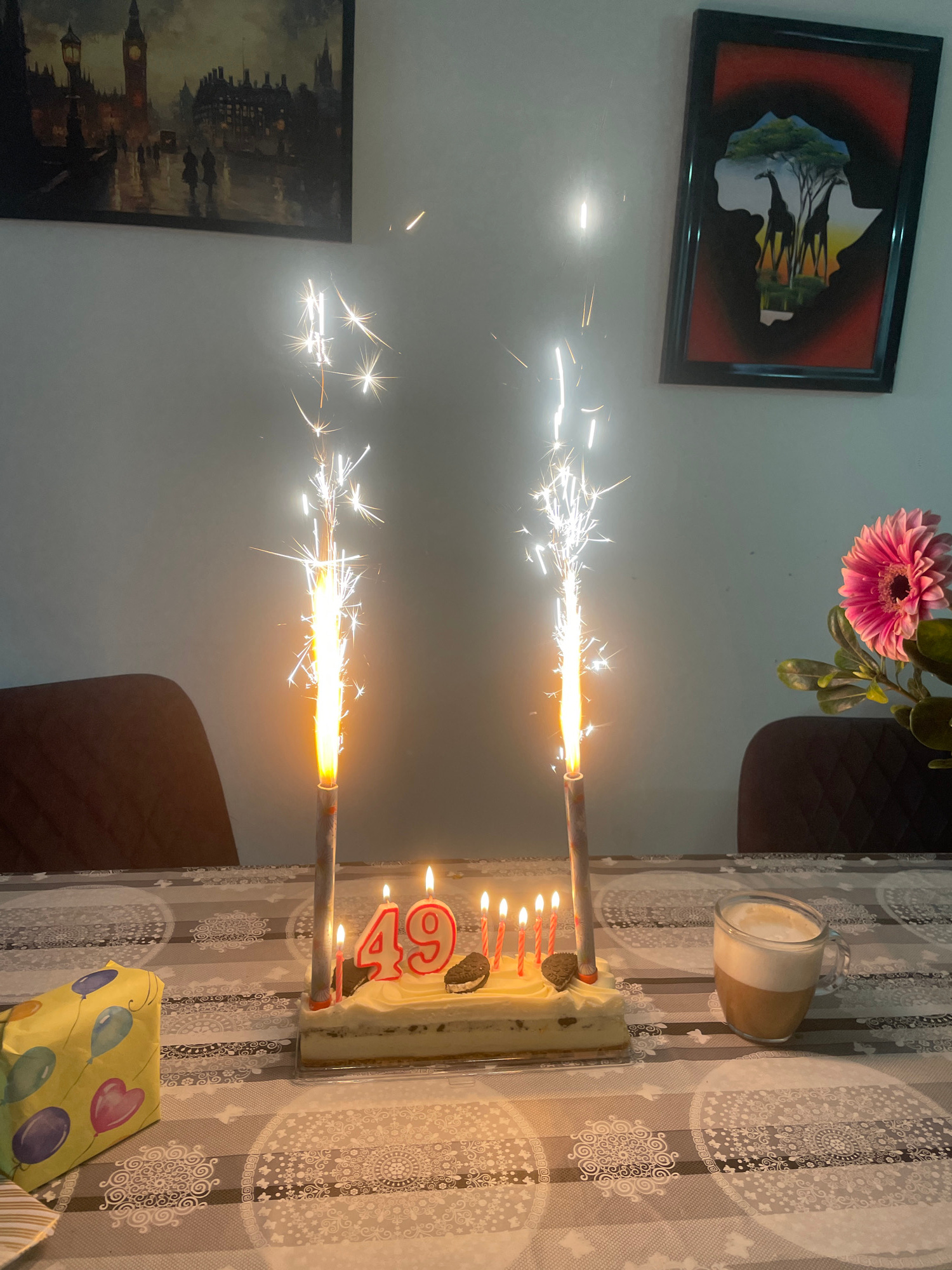 The image depicts an indoor birthday celebration scene in Raanana, Israel. A rectangular cake, frosted in white and adorned with dark cookie pieces, is positioned centrally on a table covered with a gā¦read more