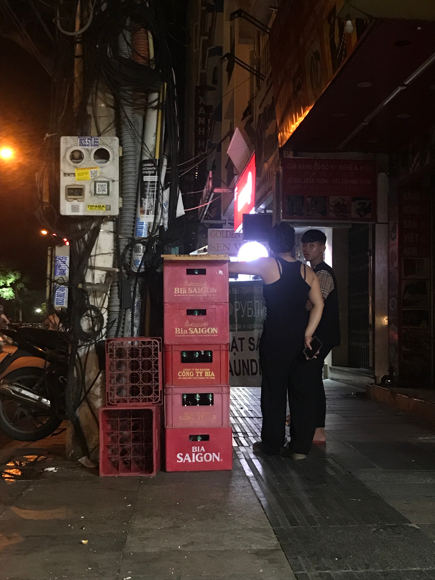 Two people are in the shot, a man and a woman. The woman is in a black dress, and the man is wearing a checkered shirt and dark pants. They are standing on a street, in front of a stack of red "Bia Sa…read more