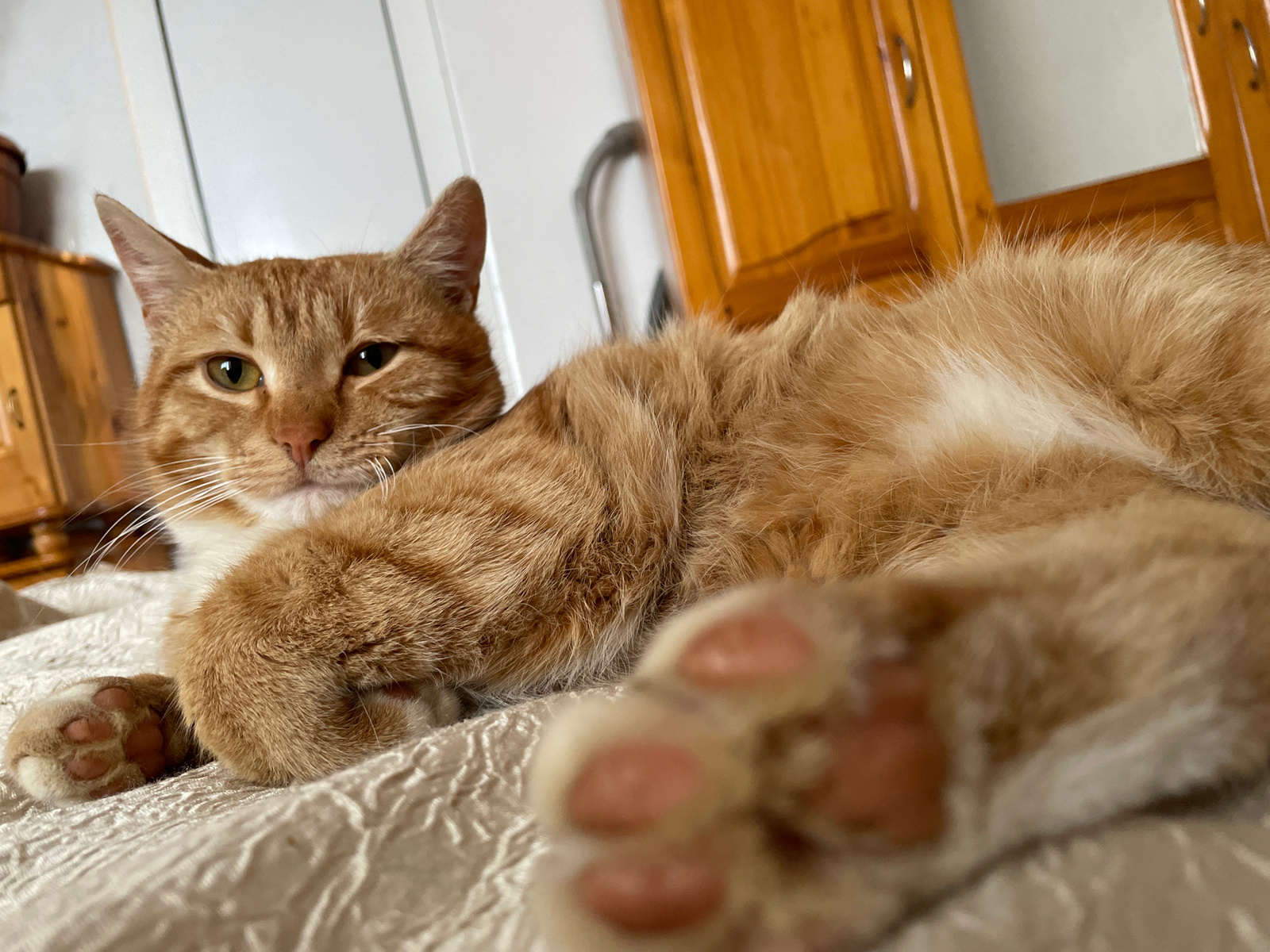 An orange tabby cat is lying on a textured, light-colored surface, likely a bed, with its paws extended towards the camera. The cat has green eyes and white markings on its chest. In the background, a…read more