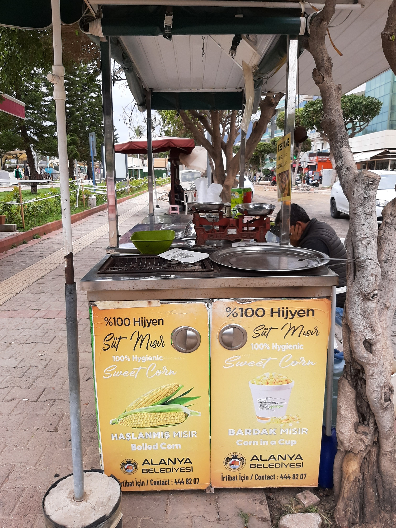 Here is a description of the image: The image shows a vendor stall in Alanya, Turkey, selling sweet corn. The stall is set up on a brick-paved walkway, with a tree branch partially obscuring the view…read more
