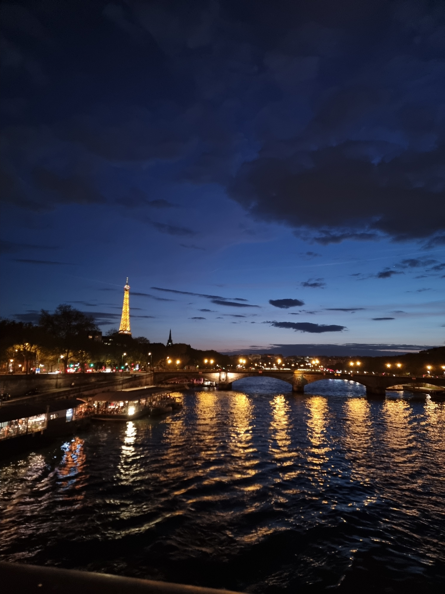 The image is a nighttime view of the Eiffel Tower in Paris, France. The tower is illuminated and stands prominently against a dark blue sky with scattered clouds. Below the tower, city lights create a…read more