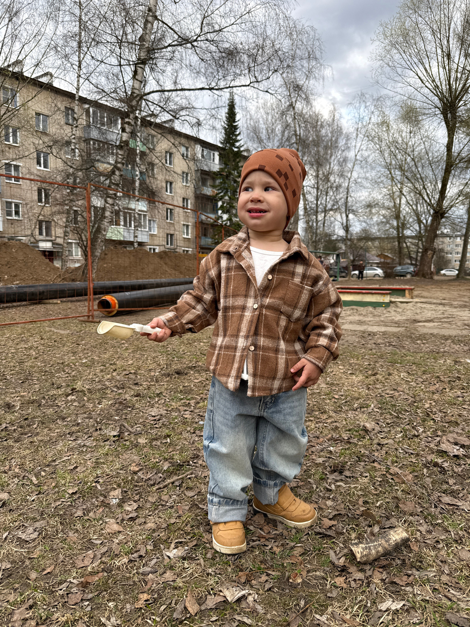 A young child, likely a toddler, stands outdoors on a cool, overcast day in what appears to be an urban or suburban setting, possibly in Rusanovo, Russia. The child wears a brown patterned beanie, a b…read more