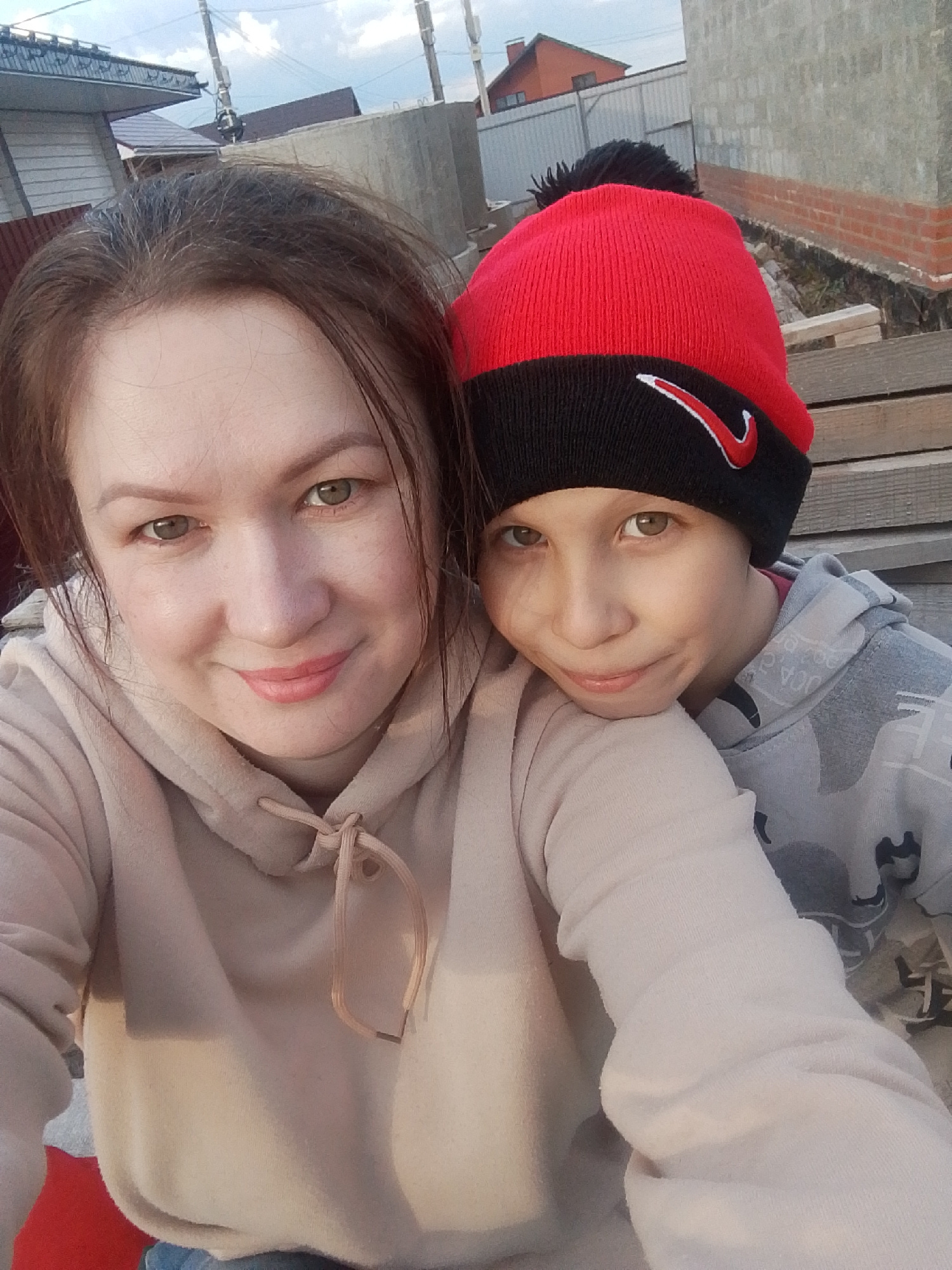 A selfie shows a woman and a child outdoors in Прикамский, Russia. The woman, on the left, wears a beige hoodie and has brown hair. The child, on the right, wears a grey camouflage hoodie and a red an…read more