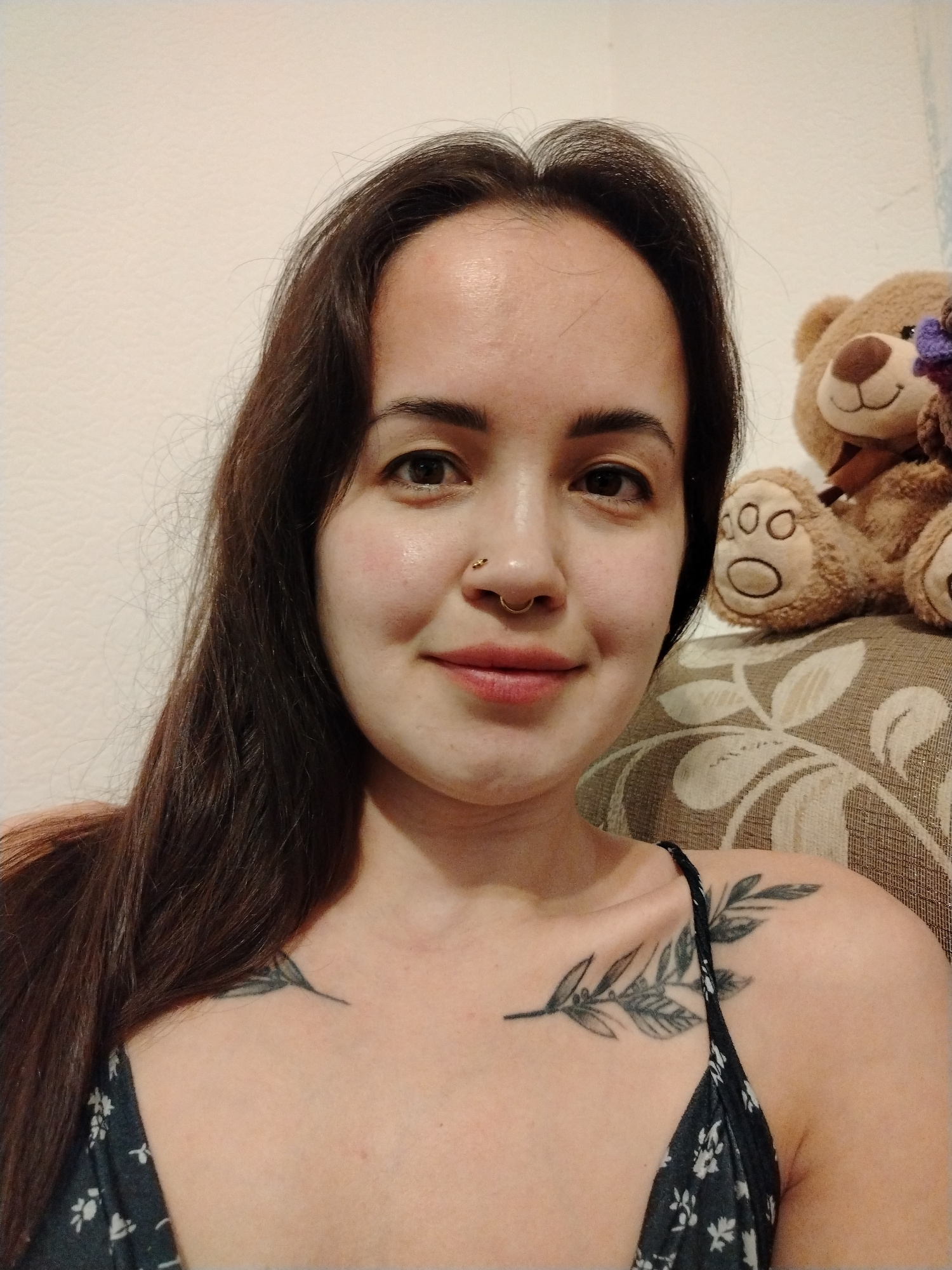 A woman with long brown hair is in a well-lit indoor environment, possibly a home. She is fair-skinned and has a nose piercing. The woman is wearing a black and white floral patterned top. Two tattoosโฆread more