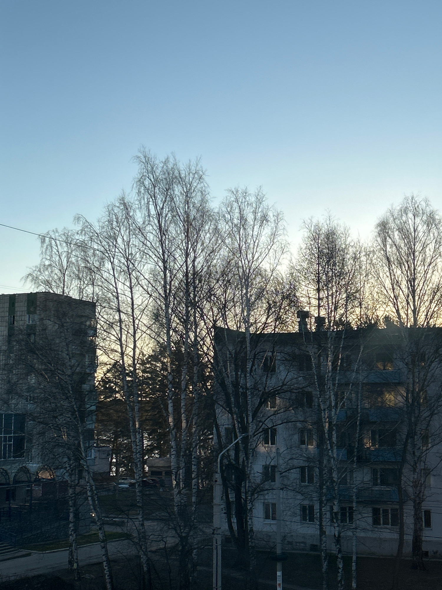 The image shows a view of buildings and trees in Chaikovsky, Russia. The foreground is dominated by bare trees, their branches reaching upwards towards the sky. Behind the trees are several multi-stor…read more
