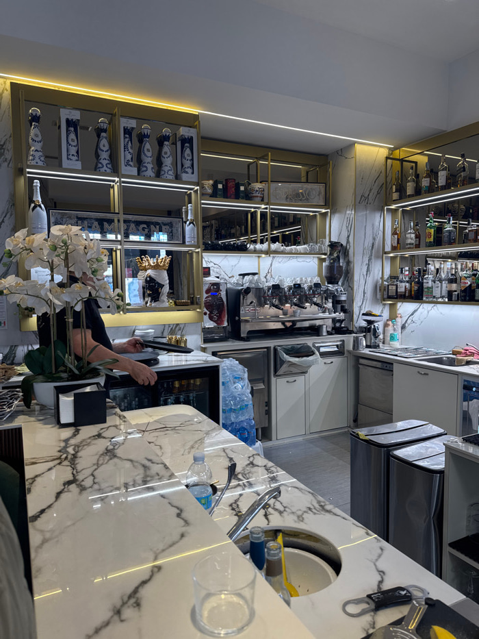 The image displays the interior of a contemporary bar or cafe, located in Milan, Italy. The environment features walls and a prominent bar counter constructed from white marble with distinct dark grey…read more