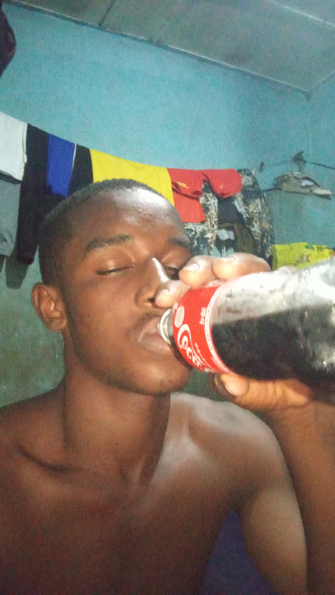 A shirtless Black man is drinking from a Coca-Cola bottle. His eyes are closed as he tilts the bottle towards his mouth. The man is indoors with a blue wall behind him. Clothes hang on a line or rod a…read more