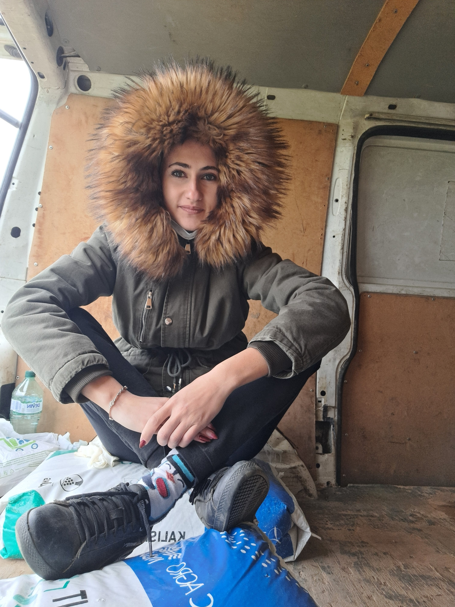 A woman is sitting inside a van in Negovan, Bulgaria. She is wearing a green winter jacket with a fur-lined hood, black pants, and black shoes with a snowman sock on one foot. She is sitting on a blue…read more