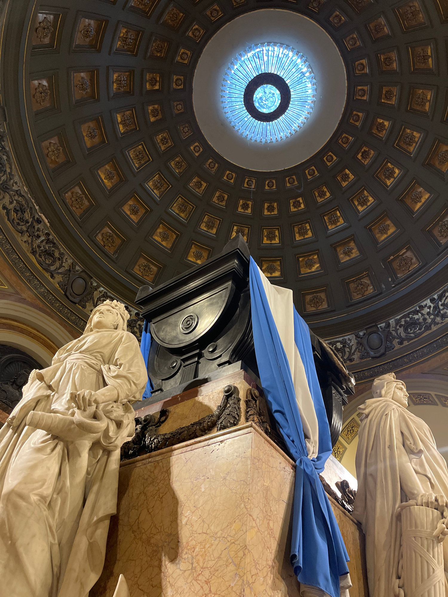 The image depicts a view upward inside a building in Buenos Aires, Argentina. A marble statue of a person lying down rests on a marble structure. The Argentinian flag is draped around it. The ceilingβ¦read more