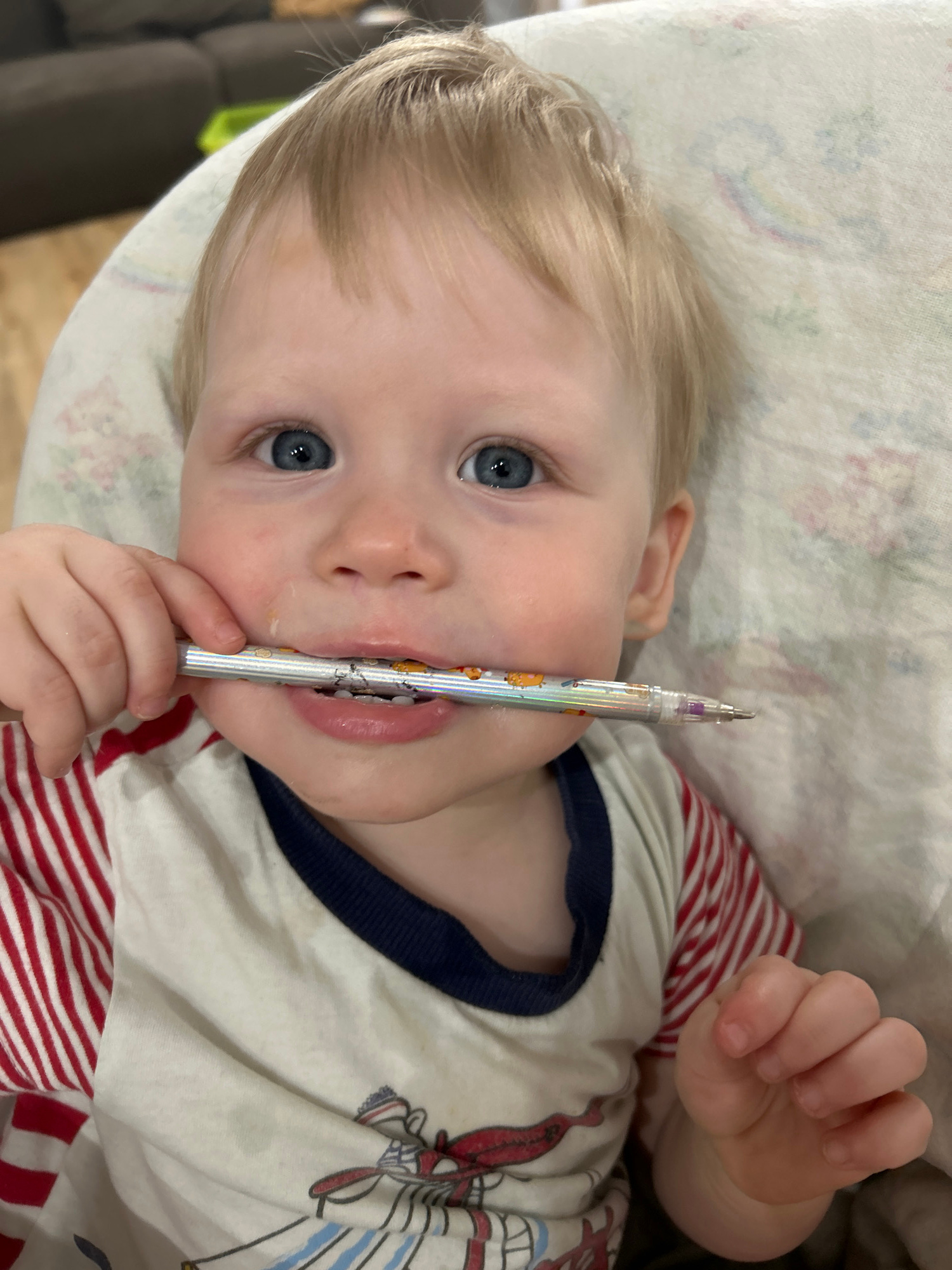 A young child with blond hair and blue eyes is lying down and holding a mechanical pencil in their mouth. The child is wearing a shirt with red and white stripes and a blue collar. The child is lying…read more