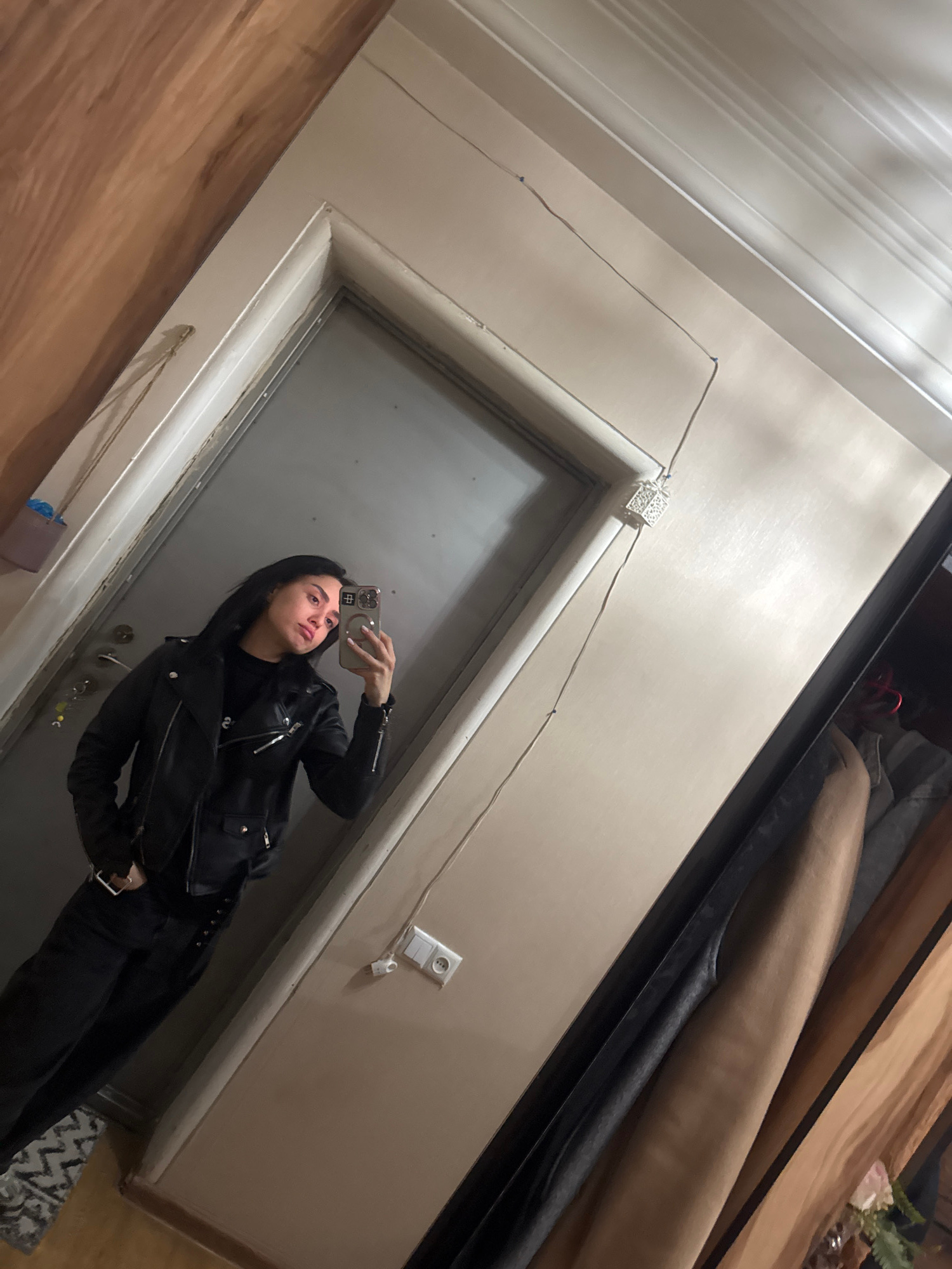 A woman stands in front of a mirror, taking a selfie. She is wearing a black leather jacket and black pants. The mirror is framed in a light-colored wood and the surrounding wall is a neutral beige. A…read more