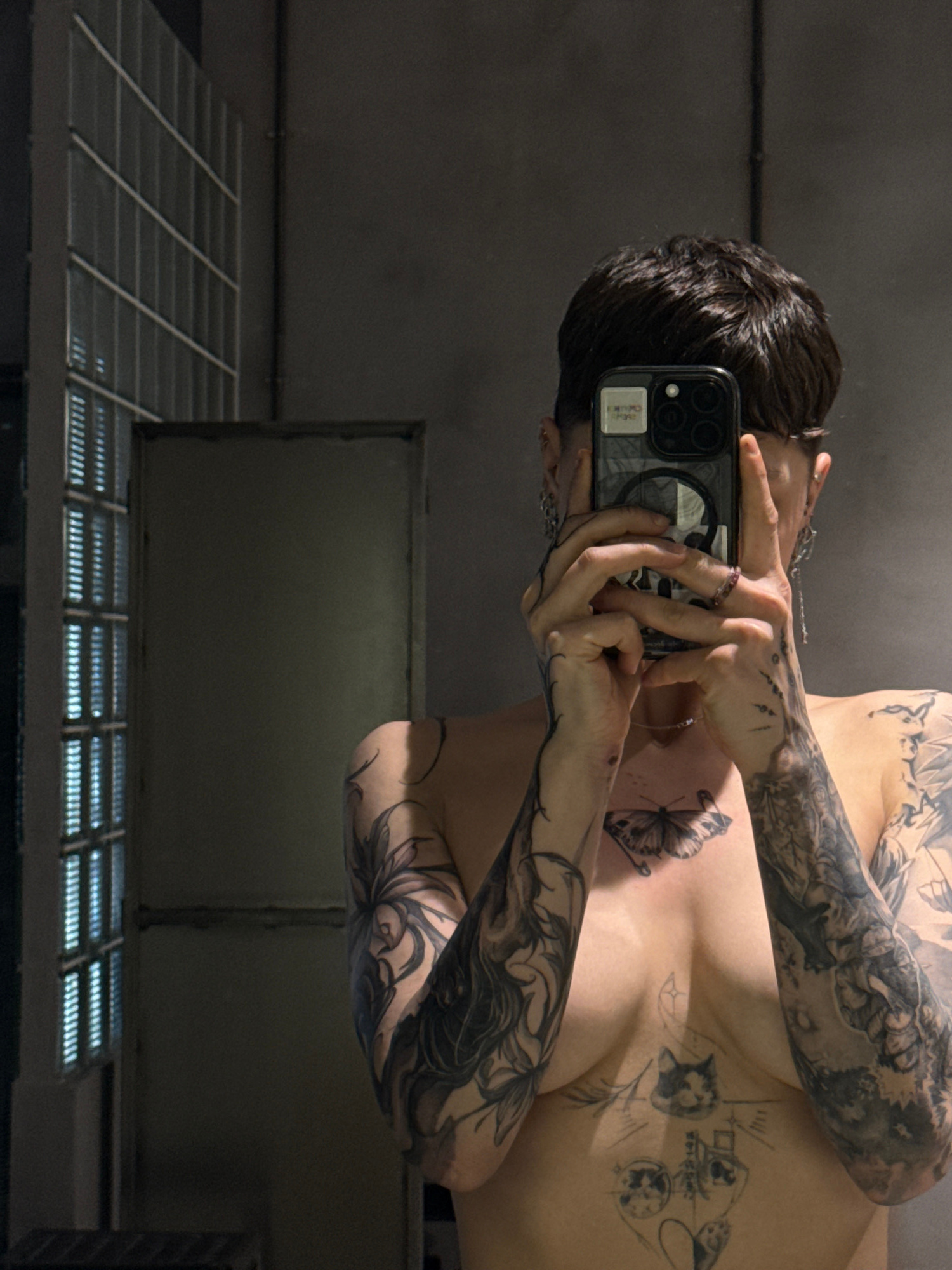 A person is taking a selfie in a mirror. The person has tattoos on their arms, chest, and collarbone. The tattoos include images of trees, flowers, butterflies, and abstract designs. The person is hol…read more