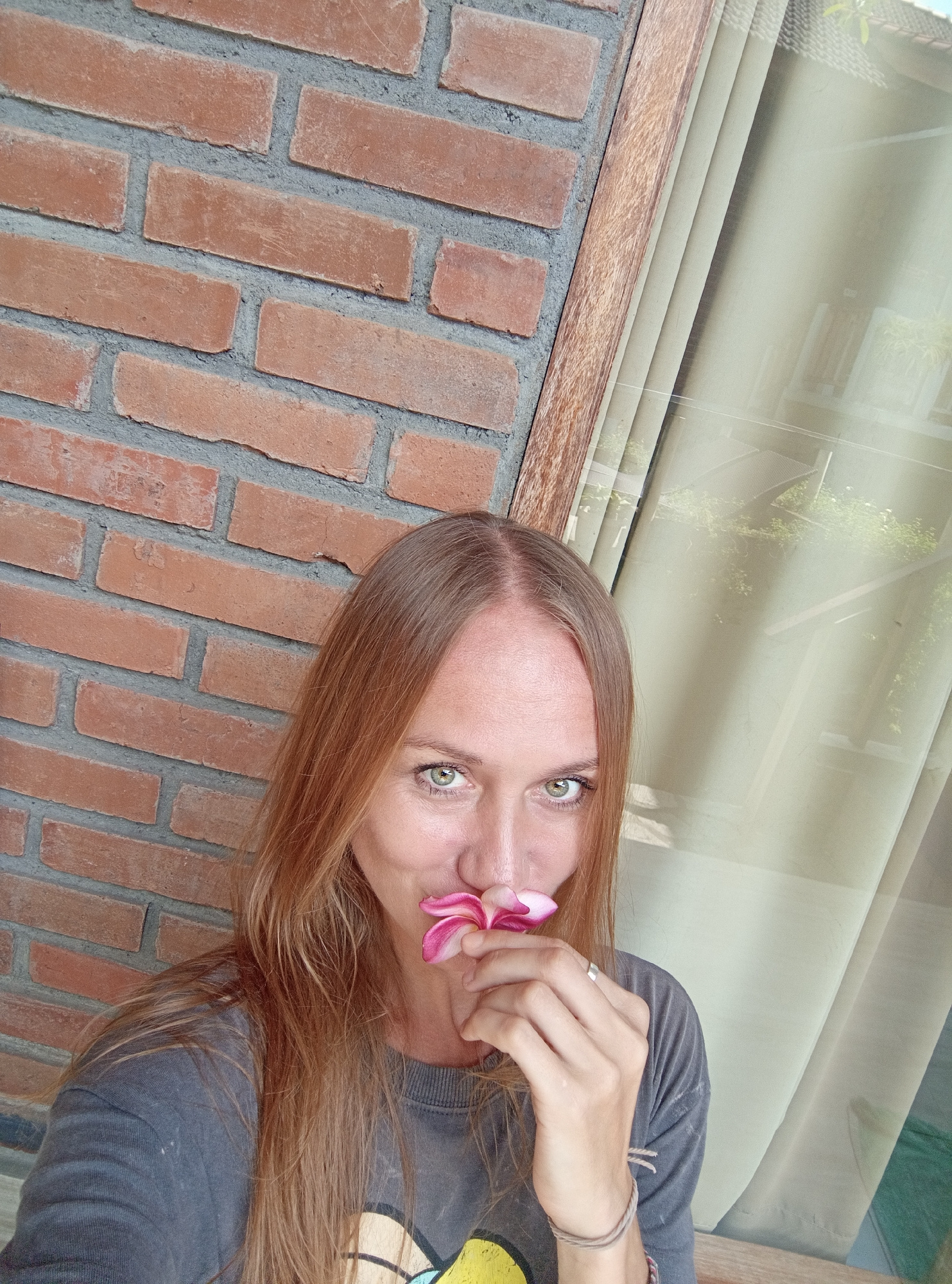 The image depicts a woman with light brown hair and green eyes, holding a pink plumeria flower near her face. She wears a gray sweatshirt and a ring on her finger. The background features a red brick…read more