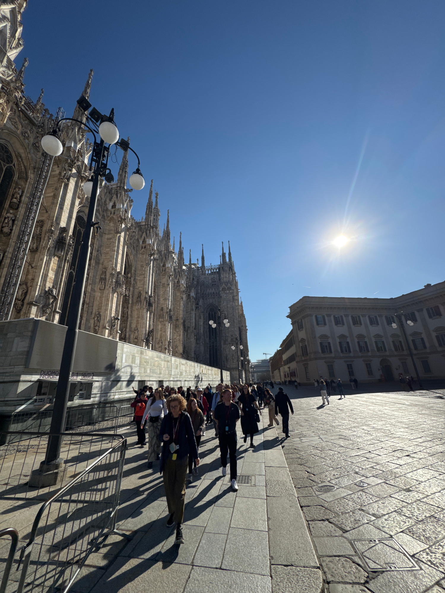 The image shows the Duomo di Milano, the iconic cathedral in Milan, Italy. A group of people is walking along the sidewalk beside it. The building next to the Duomo is visible in the background. The s…read more