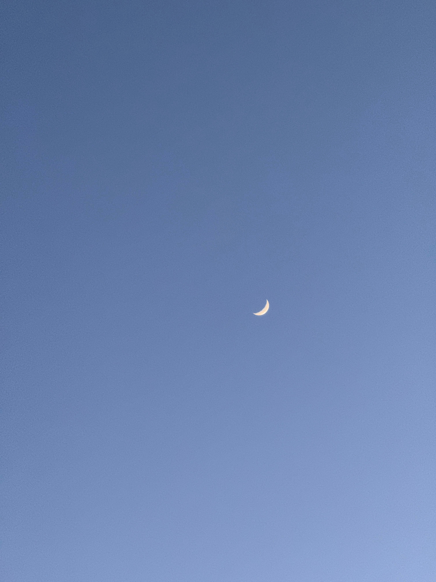 The image captures a clear, expansive blue sky, indicative of daytime conditions. A distinct, pale crescent moon is prominently featured in the upper central area of the frame. The sky is a uniform, v…read more