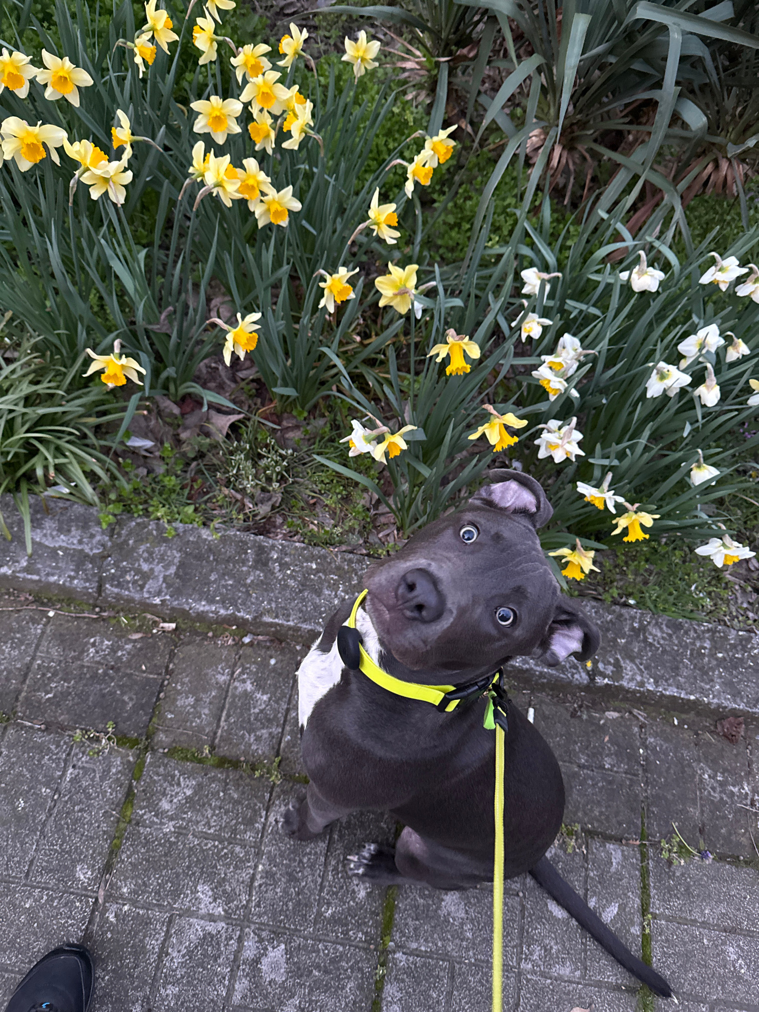 A medium shot captures a gray pitbull puppy with a white chest, wearing a yellow collar and leash, standing on a gray brick sidewalk next to a bed of daffodils in full bloom. The daffodils are a mix o…read more