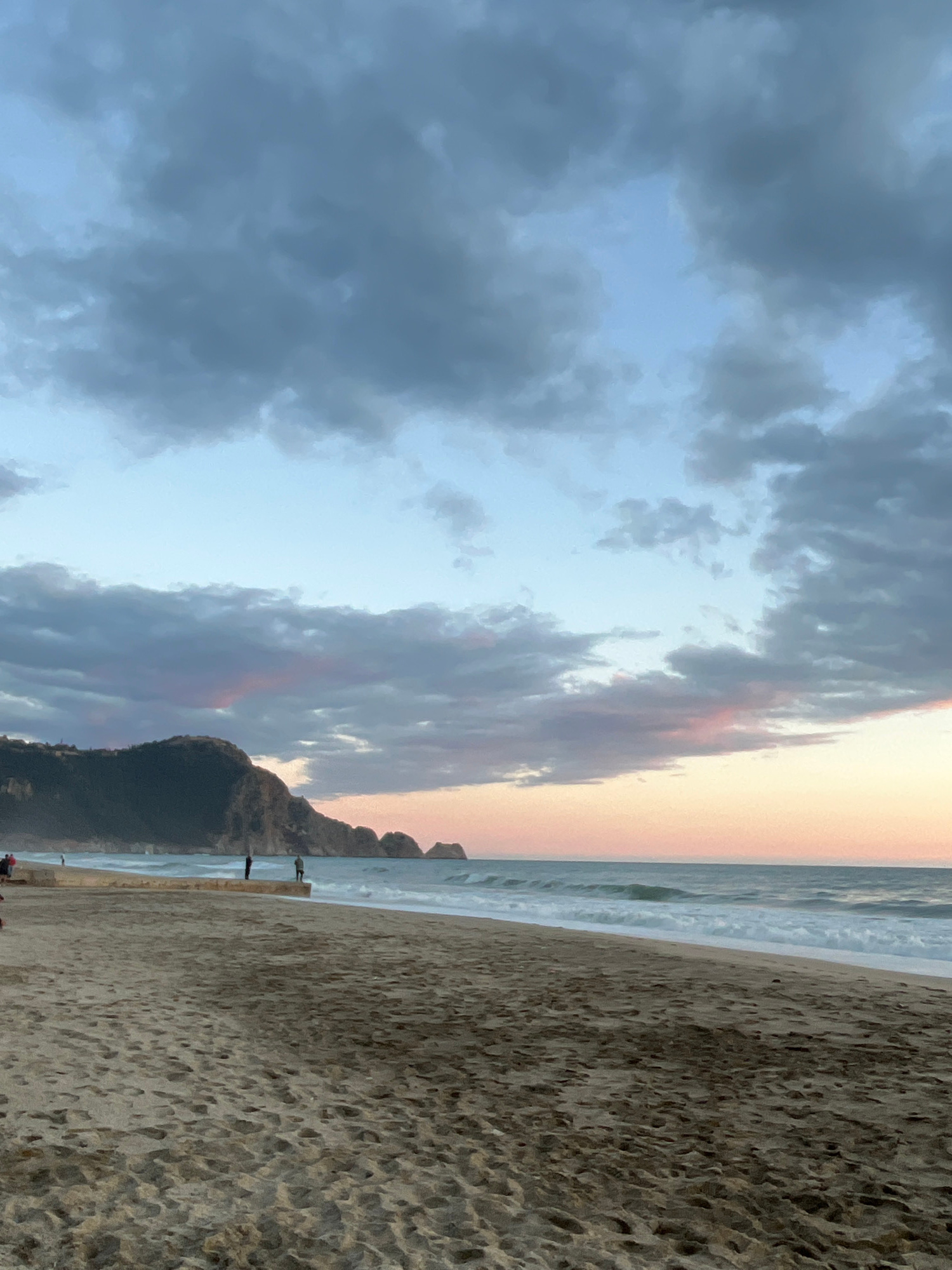 The image shows a beach scene in Alanya, Turkey, at dusk. The sky is filled with dark, textured clouds on the left, transitioning to lighter clouds tinged with pink and orange hues towards the right,…read more