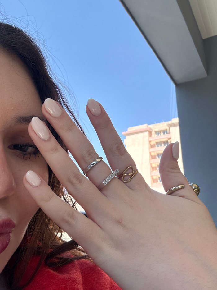 A person holds a hand with several rings in front of a blue sky and a building. The rings are varying styles and colors, including gold, silver, and a ring with embedded stones. The person has painted…read more
