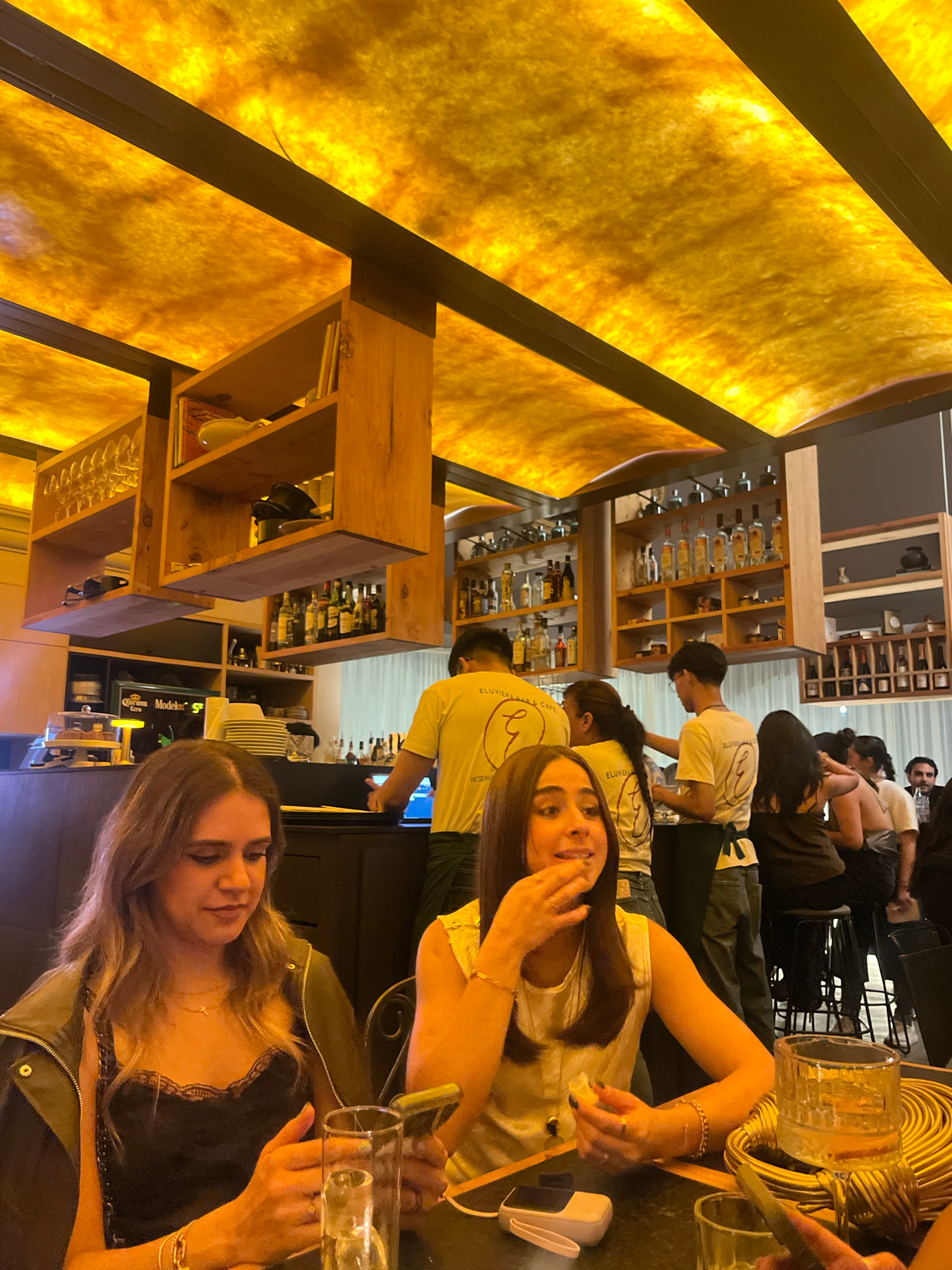 The image depicts the interior of a bar in San Andrés Cholula, Mexico. The scene is populated with several individuals. Two women are prominently positioned in the foreground. One woman is wearing a b…read more
